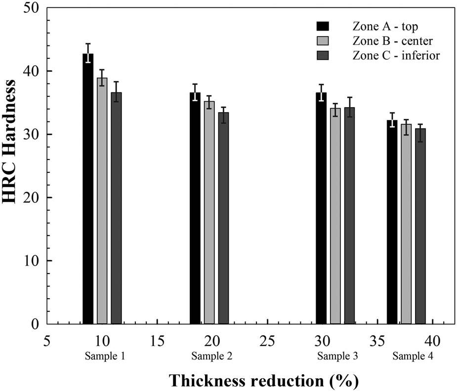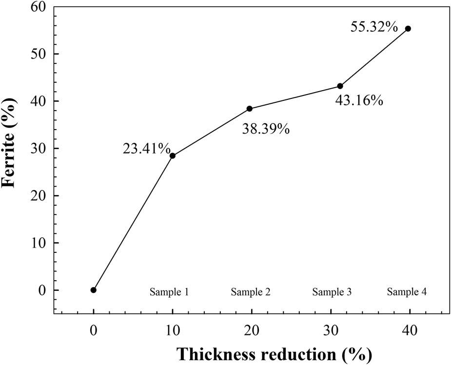 | Sample | Number of passes | Reduction (%) | Final thickness (mm, initial = 15.20) | Finishing temperature (°C) |