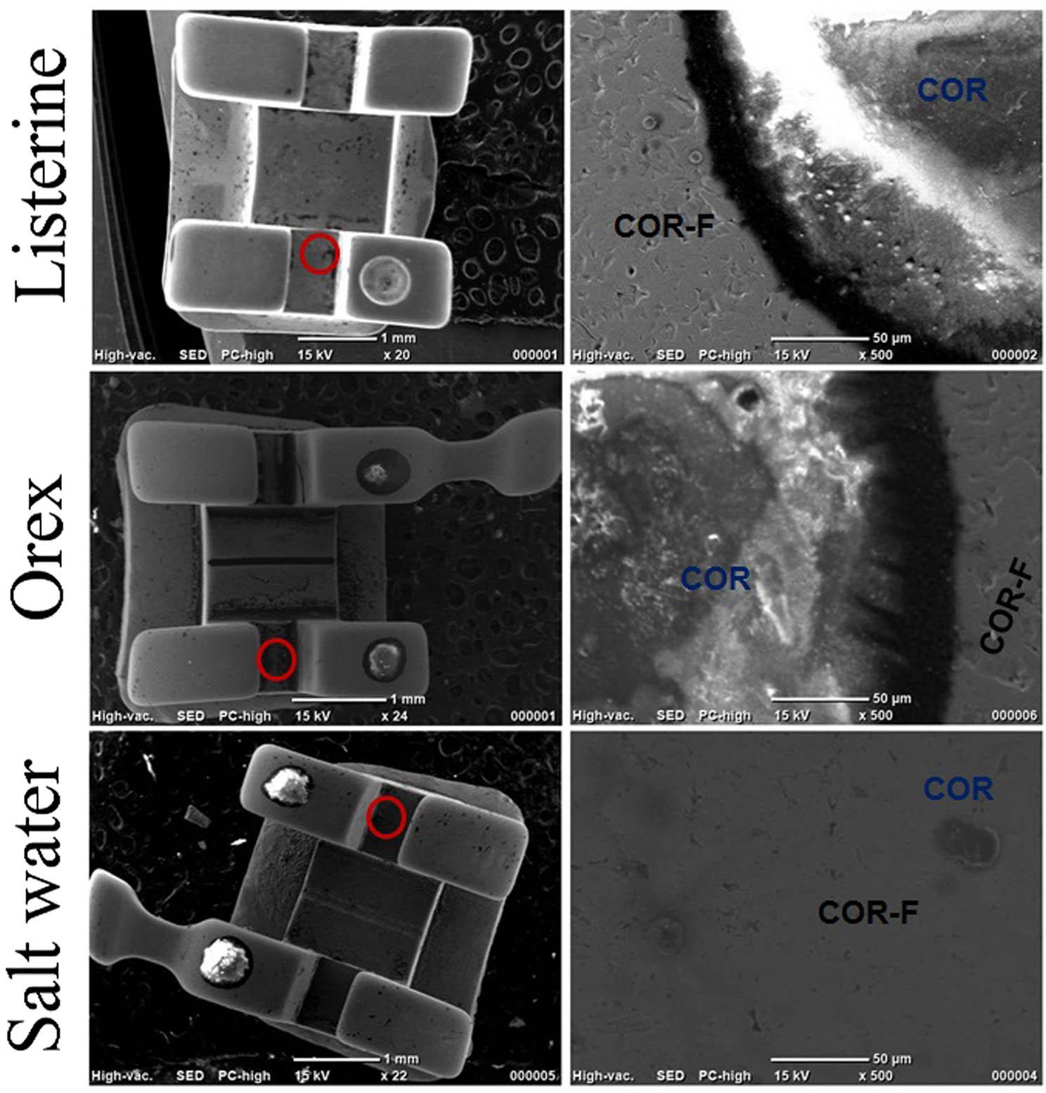 Chemical element concentrations of the COR-F and COR spots of the brackets obtained via EDS_