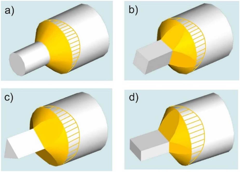 In the case of extrusion of axisymmetric cross-sections (e.g. circular), a conical plastic zone model is typically assumed. This assumption does not hold for non-axisymmetric sections. During extrusion of such profiles, the plastic zone takes on a different shape compared to that of a circular profile. This variation arises from the complex nature of the flow caused by the transition from the circular ingot cross-section to the non-circular product cross-section, as well as from the different configurations of deformation zones (in terms of size, shape, and volume) depending on the product geometry (Figure 1).