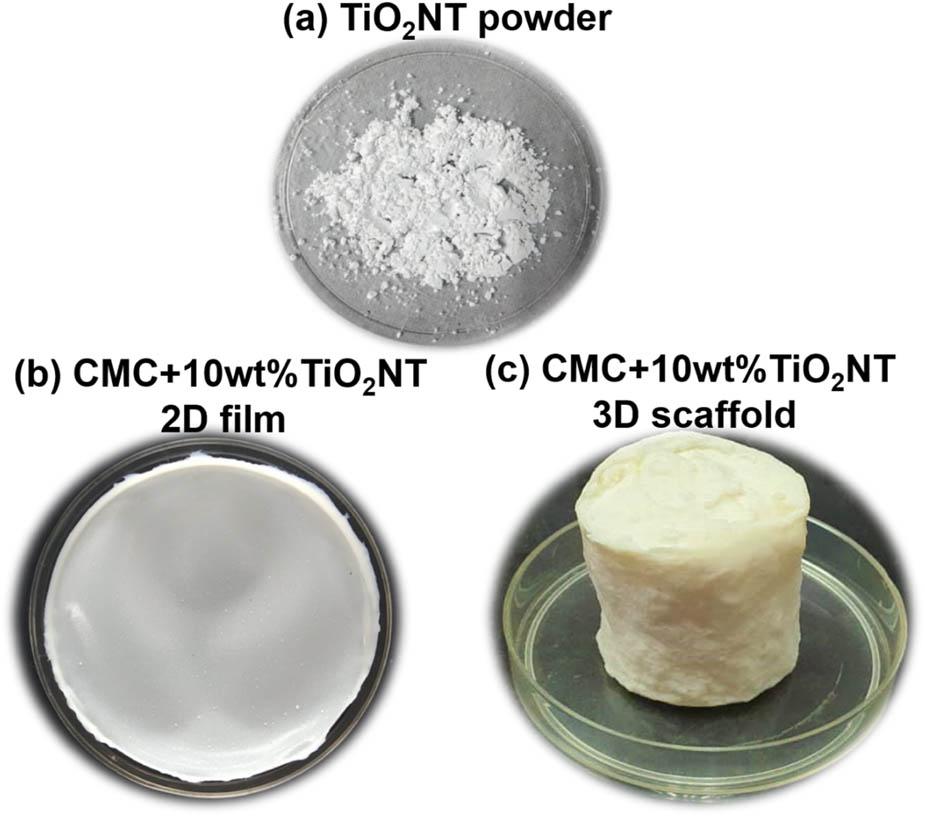 Photo images of (a) synthesis TiO2NT powder, (b) CMC + 10 wt% TiO2NT 2D film, and (c) CMC + 10 wt% TiO2NT 3D scaffold.