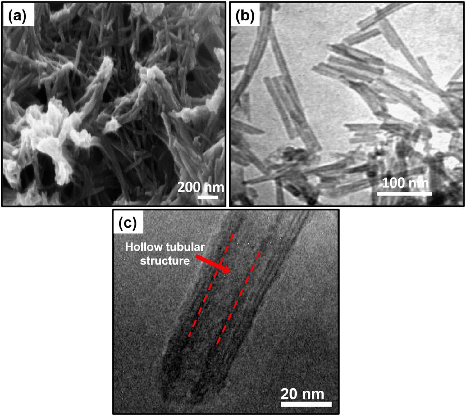 (a) SEM, (b) TEM, and (c) high resolution TEM micrographs of hydrothermally synthesized TiO2NT.