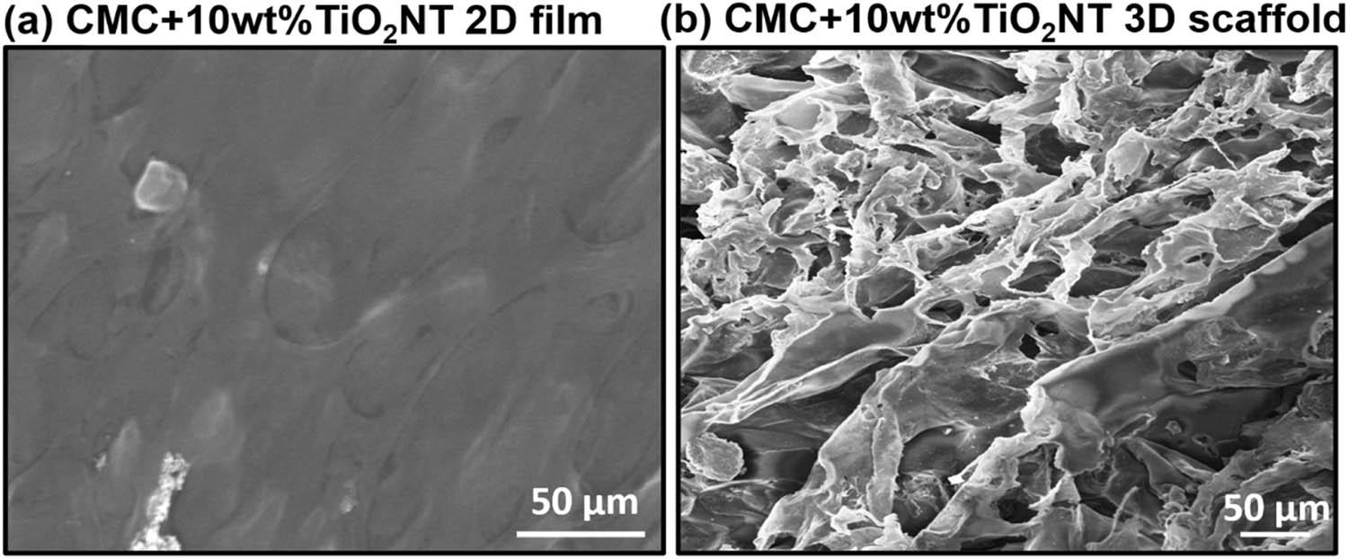 SEM micrograph of (a) CMC + 10 wt% TiO2NT 2D film and (b) CMC + 10 wt% TiO2NT 3D scaffold.