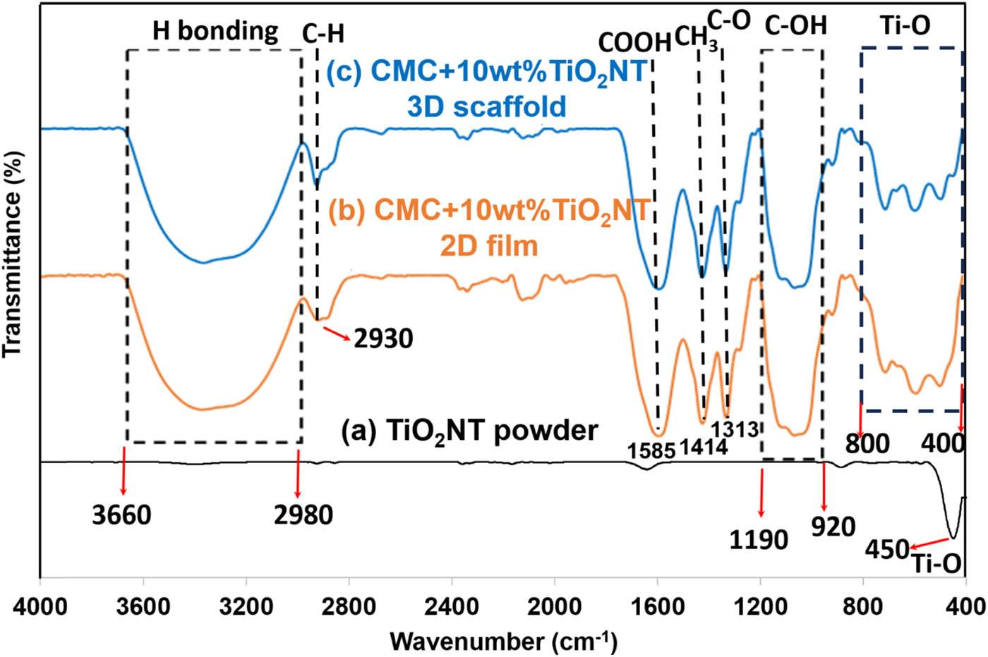 FTIR spectra of (a) TiO2NT, (b) CMC + 10 wt% TiO2NT 2D film, and (c) CMC + 10 wt% TiO2NT 3D scaffold CMC scaffold.