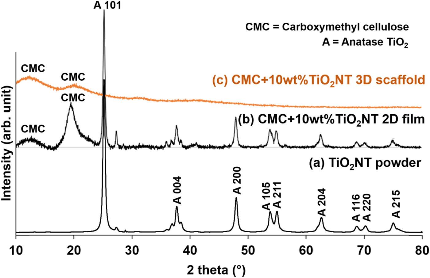 XRD patterns of (a) TiO2NT, (b) CMC + 10 wt% TiO2NT 2D film, and (c) CMC + 10 wt% TiO2NT 3D scaffold CMC scaffold.