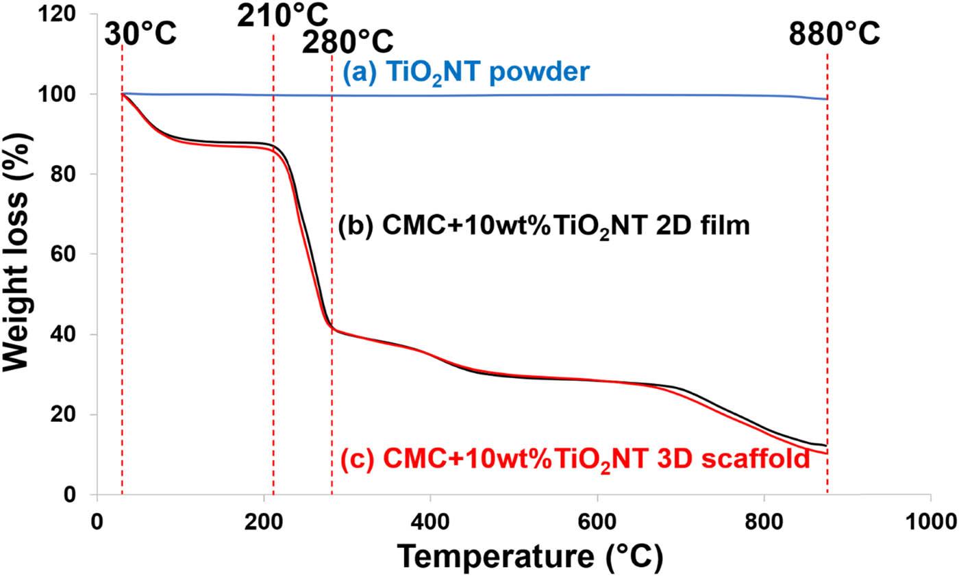 Thermogravimetric analysis (TGA) was employed to evaluate the thermal stability of TiO2NT powder, as well as CMC + 10 wt%TiO2NT 2D film and 3D scaffold samples. As illustrated in Figure 6, the synthesized TiO2NT exhibited exceptional thermal stability, with a minimal weight loss of only 1% observed up to 880°C. For both CMC + 10 wt%TiO2NT 2D film and 3D scaffold, the initial weight loss occurred between 30°C and 210°C. Based on the previous study, this weight loss is associated with the evaporation of absorbed moisture and volatile constituents [55,56], somehow the analysis of pre-dried sample could help to confirm this.