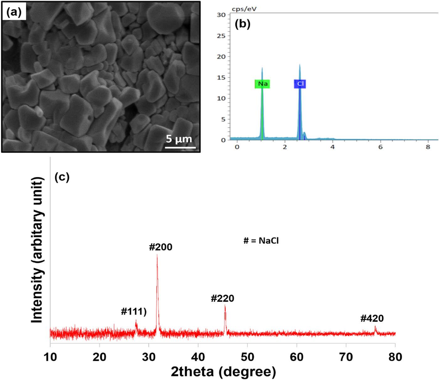 Figure 7(a) presents the SEM images of CMC + 10 wt% TiO2NT 2D film sample following immersion in SBF for 7 days. The film surface exhibits the formation of cubic crystals, which are attributed to NaCl resulting from an imbalance in ion exchange processes [60]. The NaCl compounds were confirmed by EDX analysis as Na and Cl elements were detected (Figure 7(b)). The high concentration of TiO2NT in the 2D film likely disrupts the local ionic environment, causing an accumulation of Na⁺ and Cl⁻ ions on the film surface. These ions facilitate the crystallization of NaCl, which competes with and suppresses HAp nucleation [61]. The XRD diffractogram in Figure 7(c) confirms the formation of NaCl, with four distinct peaks observed at 27.47°, 31.70°, 45.50°, and 76.62°, corresponding to the 111, 200, 220, and 420 planes of the face-centered cubic structure of NaCl [62]. The high intensity and sharpness of these peaks indicate the highly crystalline nature of the produced NaCl, consistent with the SEM observations of cubic NaCl crystals. The accumulation of Na and Cl originates from the use of Na-containing precursors and chloride-based reagents during the immersion in SBF solution [63]. These ions have a stronger affinity toward surface hydroxyl groups and defect sites on the CMC + 10 wt% TiO2NT 2D film, leading to preferential surface adsorption. In contrast, other ionic species remained dissolved in the SBF solution and did not significantly participate in surface deposition.