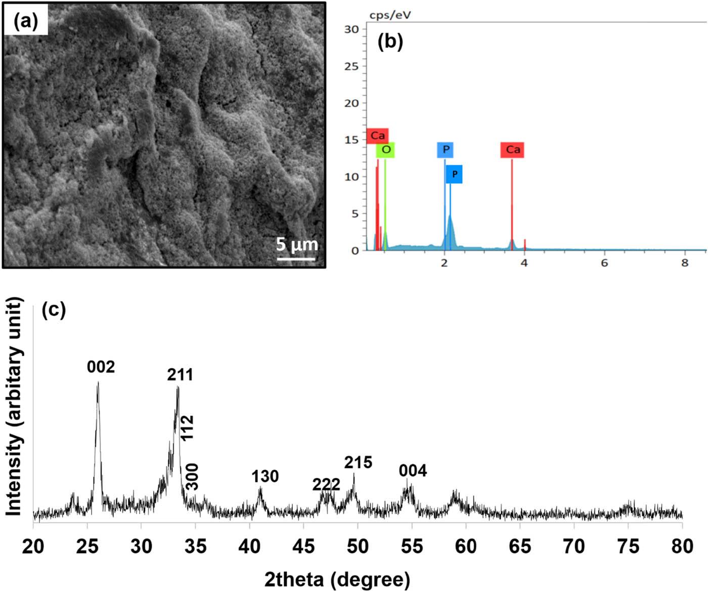(a) SEM micrograph, (b) EDX spectra, and (c) XRD pattern of CMC + 10 wt% TiO2NT 2D film after immersion in SBF for 1 week.