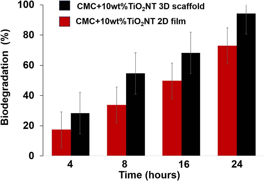 Biodegradation of CMC + 10 wt% TiO2NT 2D film and 3D scaffold within 24 h.