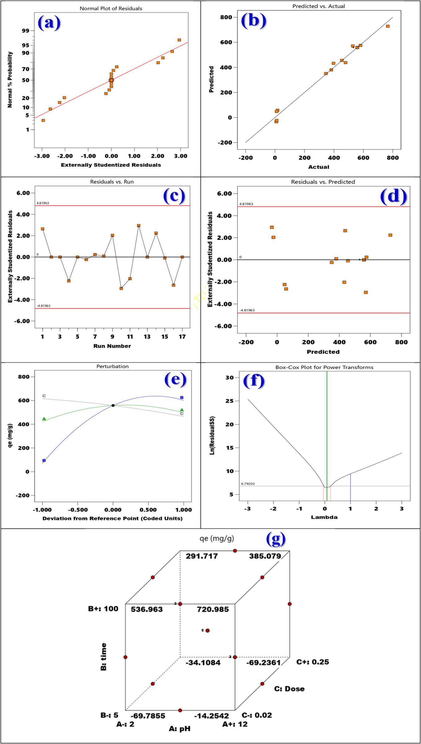 | pH | Time (min) | Dose (g) | Experimental | Predicted | Residue | Internally studentized residuals | Externally studentized residuals | |