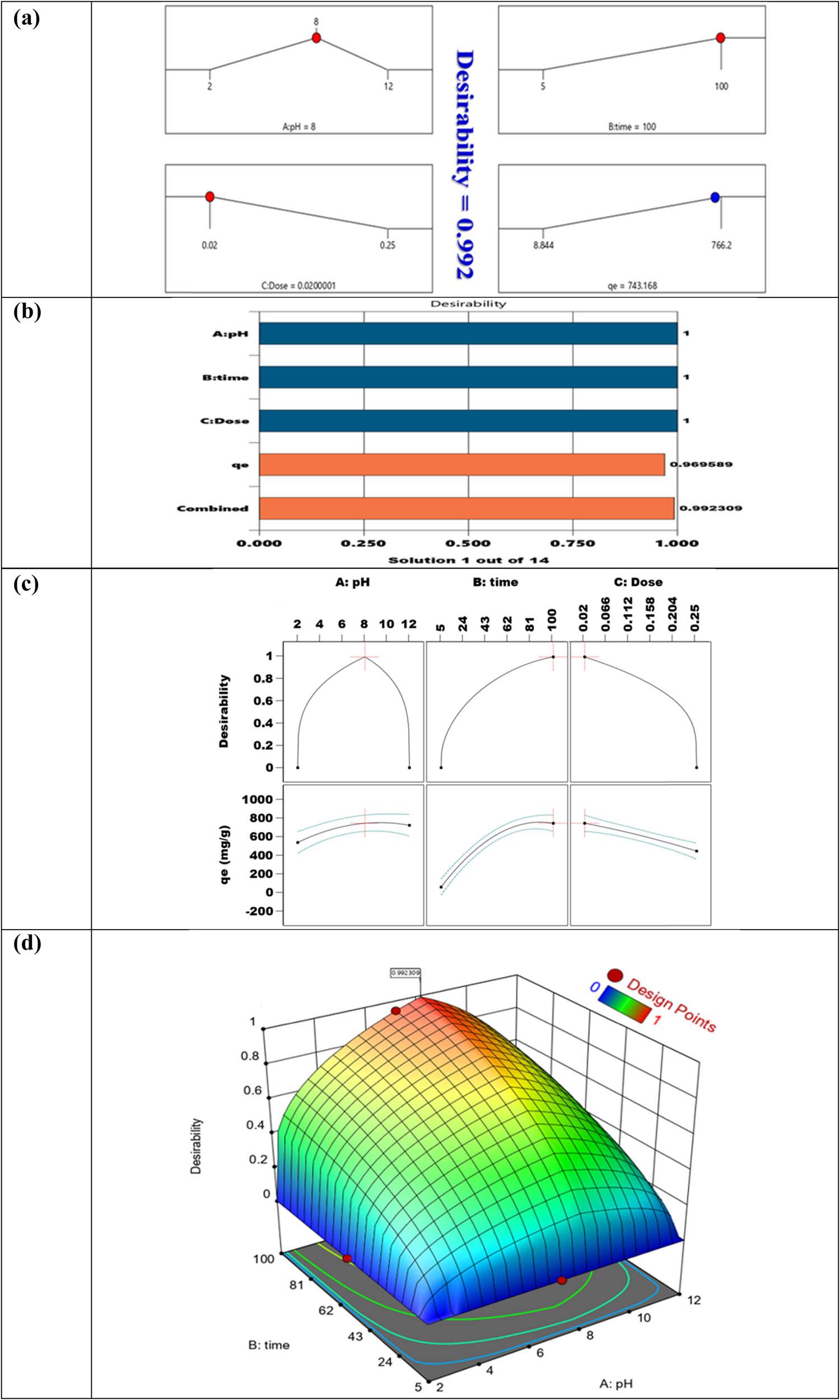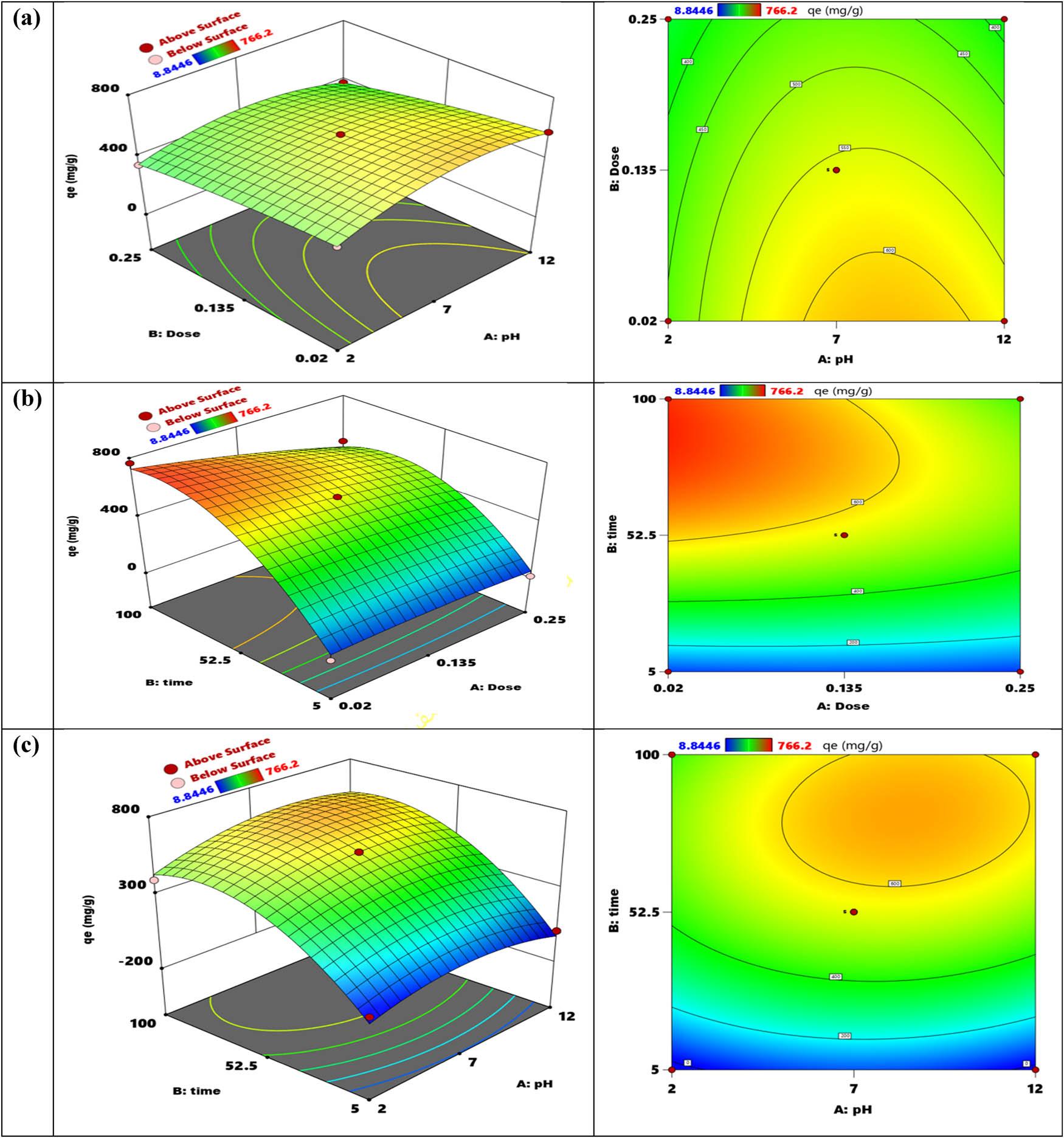 Efficiency of MV2B dye adsorption via the reaction surface’s CCD_
