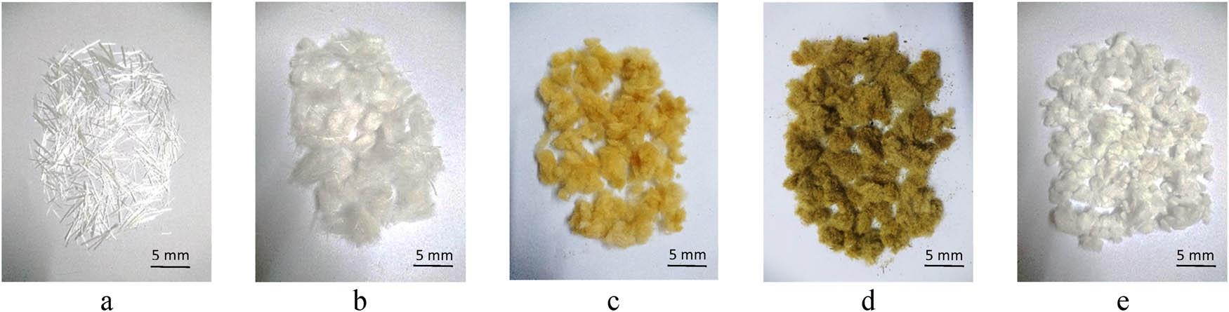 Different types of fibers: (a) E6-CR glass fiber, (b) YGT-101 glass fiber, (c) GW fiber, (d) RW fiber, and (e) CW fiber.