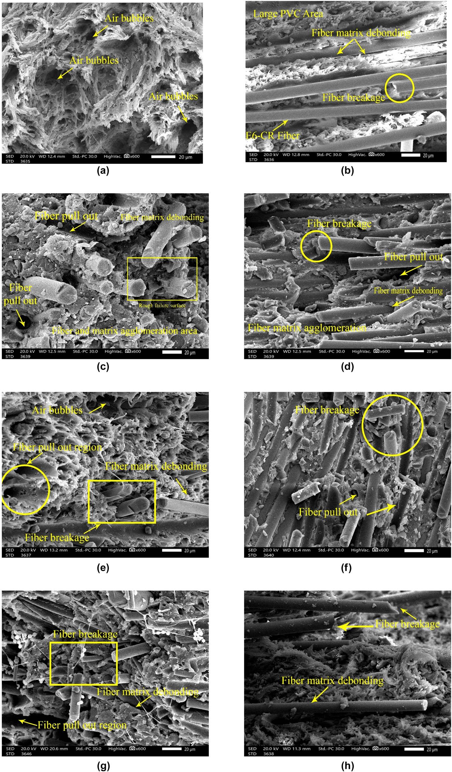 Typical SEM micrograph of longitudinal distribution of fibers in the PVC sample. (a) SEM micrograph of tensile fracture surface for pure PVC. (b) SEM micrograph of tensile fracture surface for PVC/5% E6-CR composite. (c) SEM micrograph of tensile fracture surface for PVC/30% E6-CR composite. (d) SEM micrograph of tensile fracture surface for PVC/50% E6-CR composite. (e) SEM micrograph of tensile fracture surface for PVC/5% YGT101 composite. (f) SEM micrograph of tensile fracture surface for PVC/20% YGT101 composite. (g) SEM micrograph of tensile fracture surface for PVC/50% YGT101 composite. (h) SEM micrograph of tensile fracture surface for PVC/5% GW composite. (i) SEM micrograph of tensile fracture surface for PVC/15% GW composite. (j) SEM micrograph of tensile fracture surface for PVC/50% GW composite. (k) SEM micrograph of tensile fracture surface for PVC/5% RW composite. (l) SEM micrograph of tensile fracture surface for PVC/15% RW composite. (m) SEM micrograph of tensile fracture surface for PVC/50% RW composite. (n) SEM micrograph of tensile fracture surface for PVC/5% CW composite. (o) SEM micrograph of tensile fracture surface for PVC/15% CW composite. (p) SEM micrograph of tensile fracture surface for PVC/50% CW composite.