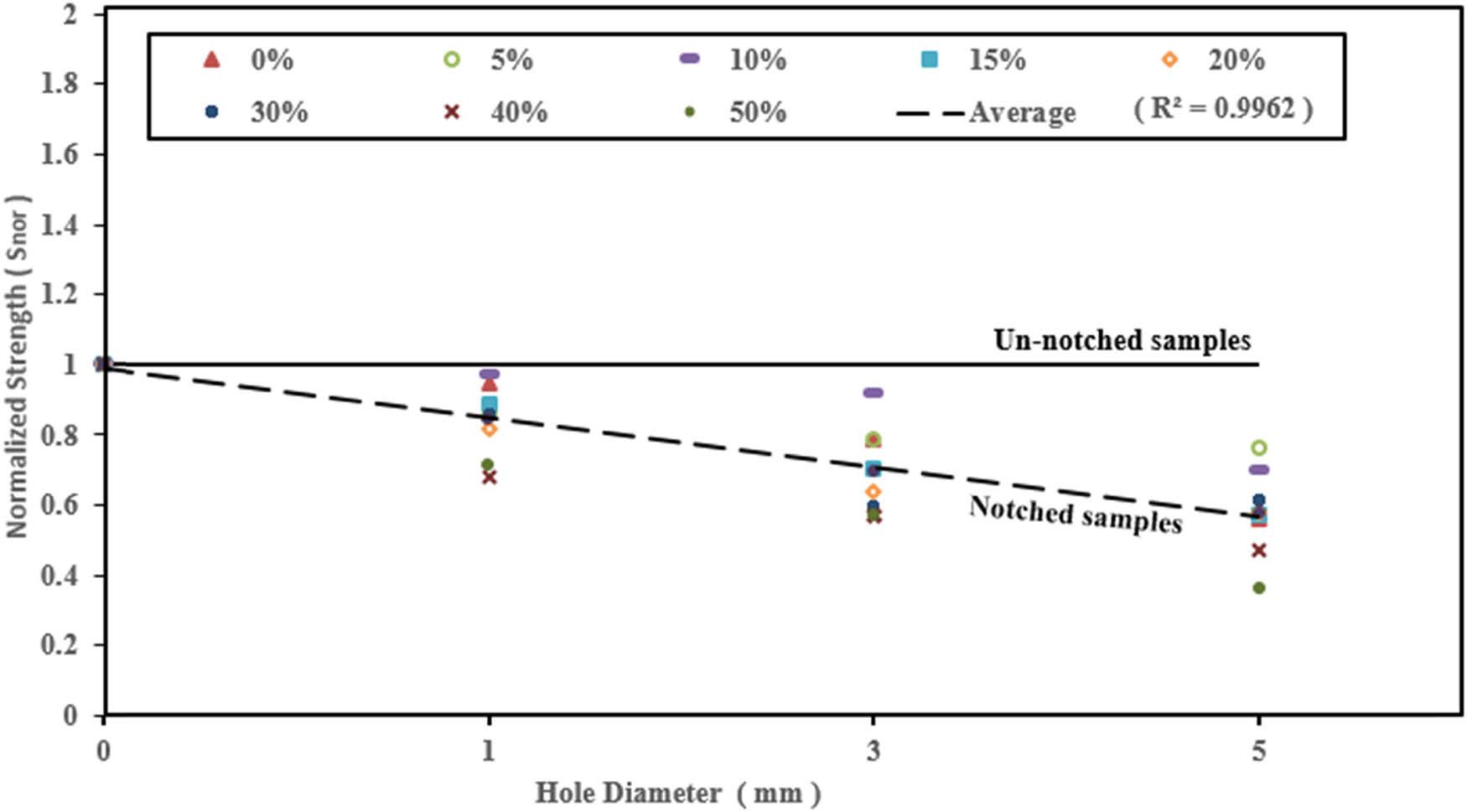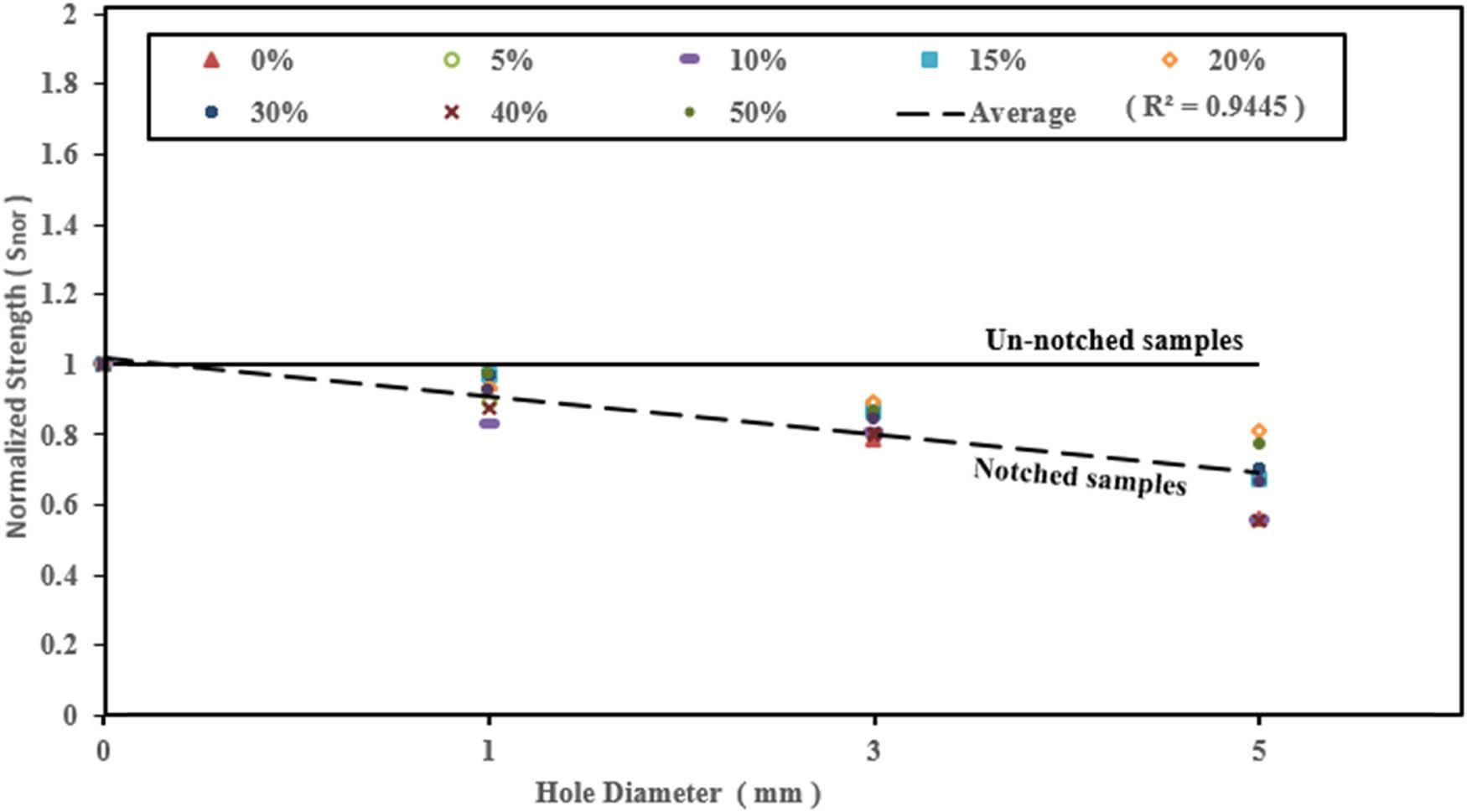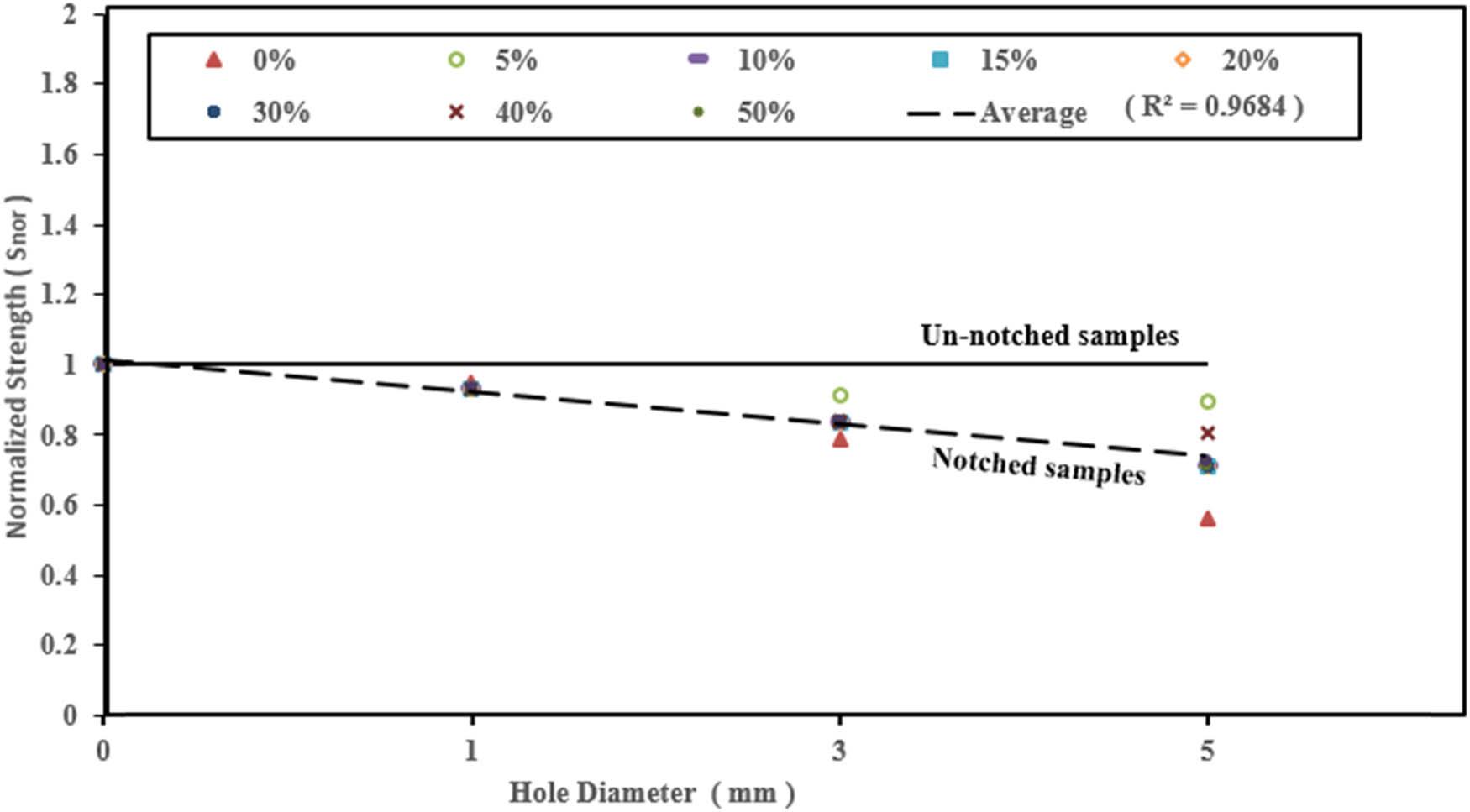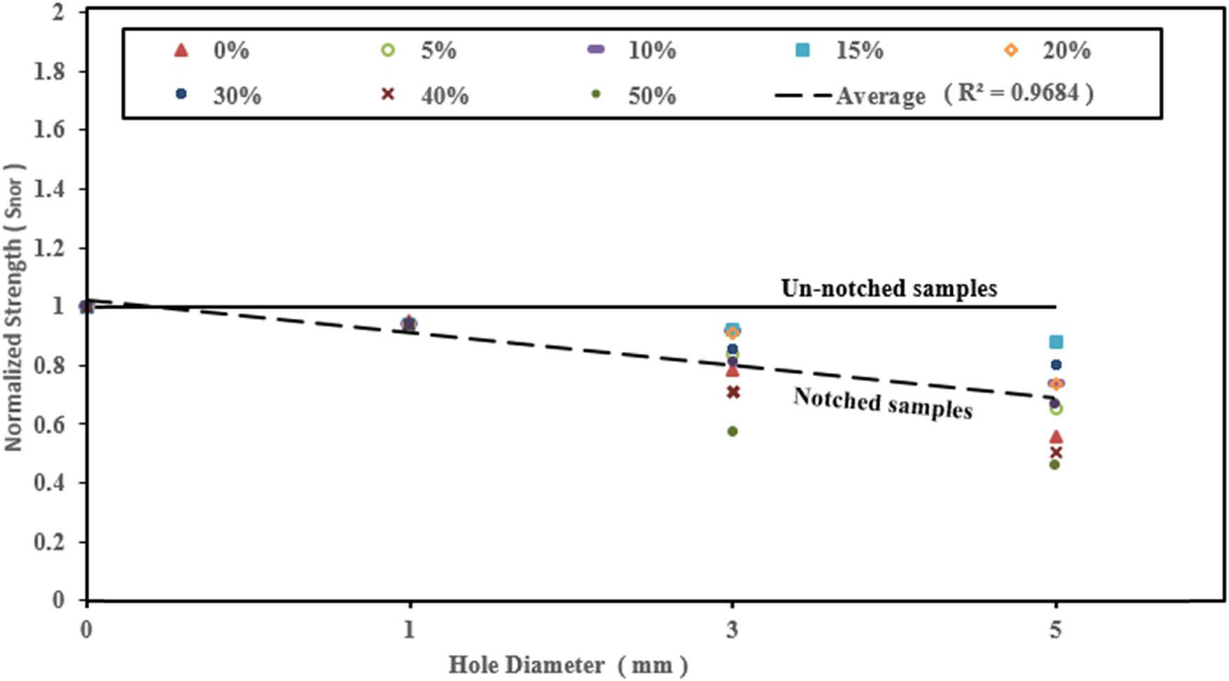 nor) and calculated from equation (3) [26,27]. For the same hole diameter, the material did not show any significant effect on the ratio between tensile strength (without and with a hole). The same results were reported on Howland’s analytical formula [8] that describes the relation between SCF and the diameter of the hole for all types of materials. From Figures 4–8, it can be advocated that as a hole diameter increases, the normalized strength decreases, which is attributed to the decrease in maximum force that leads to a decrease in S