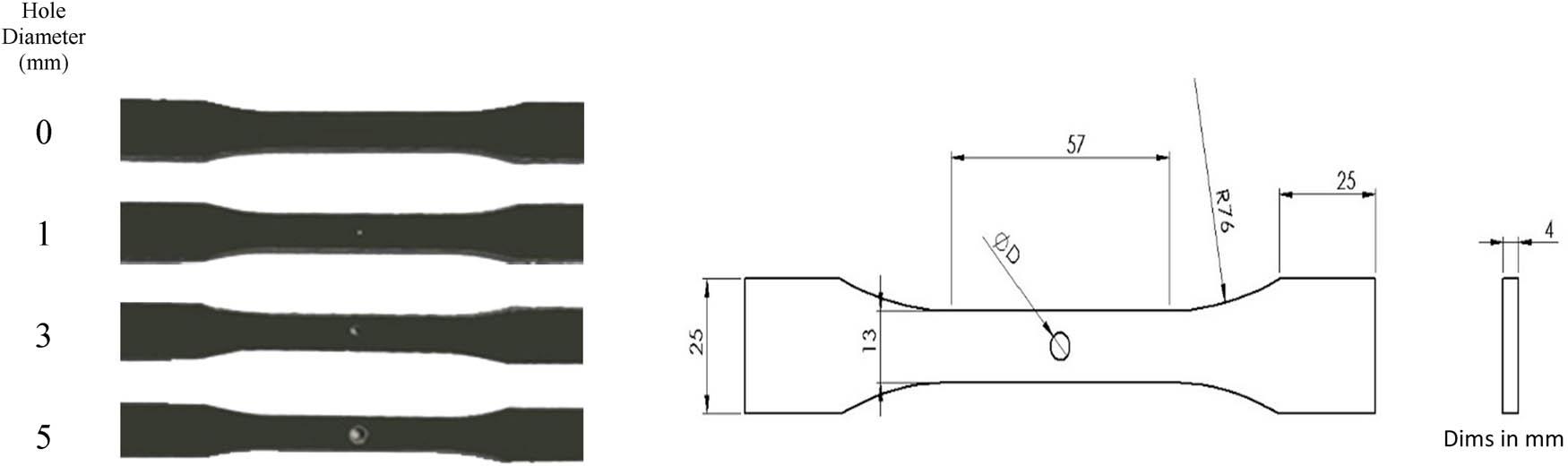 In the final step, circular holes were precisely drilled at the mid-length of each test specimen. The holes were made with three different diameters: 1, 3, and 5 mm.