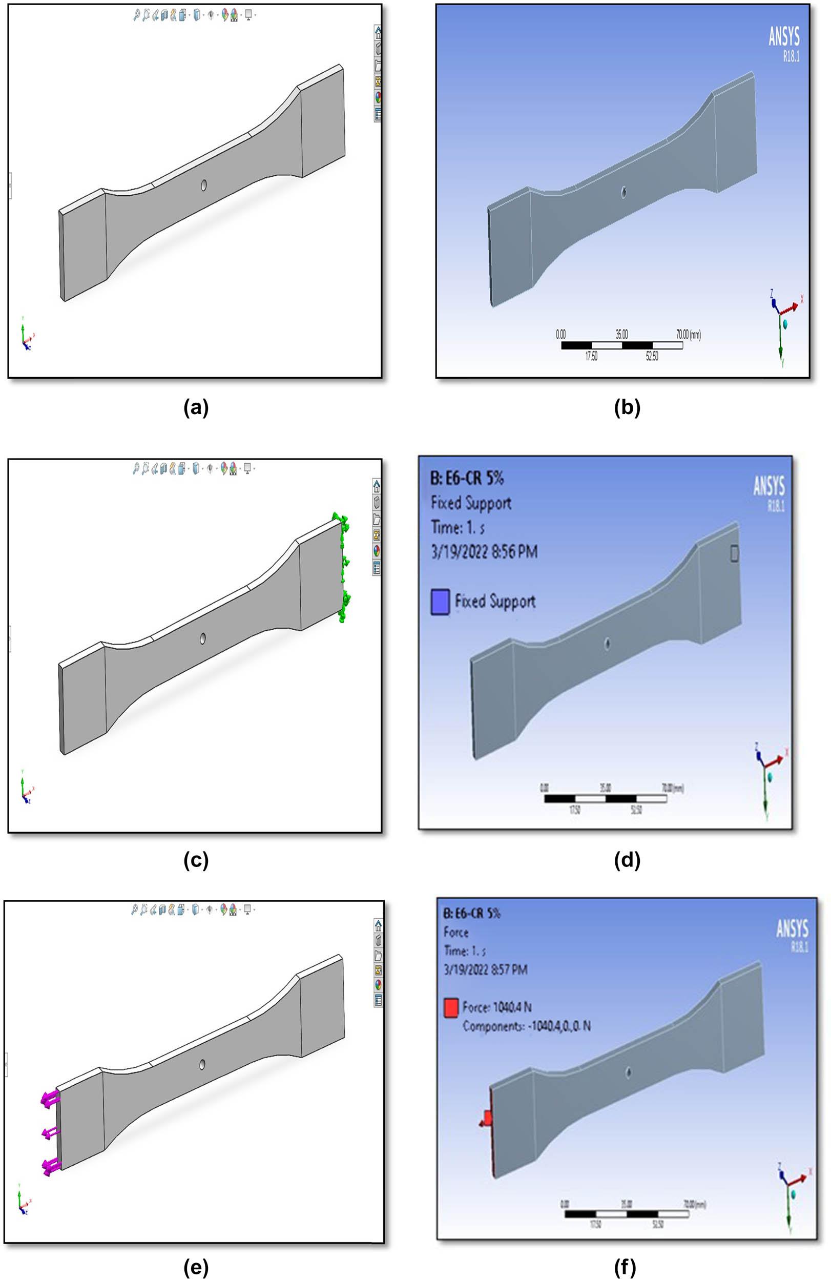In this study, the FE models are dumbbell-shaped models with dimensions mentioned in Figure 9 containing a central circular hole (1, 3, and 5 mm in diameter) and are presented in Figure 10a and b.