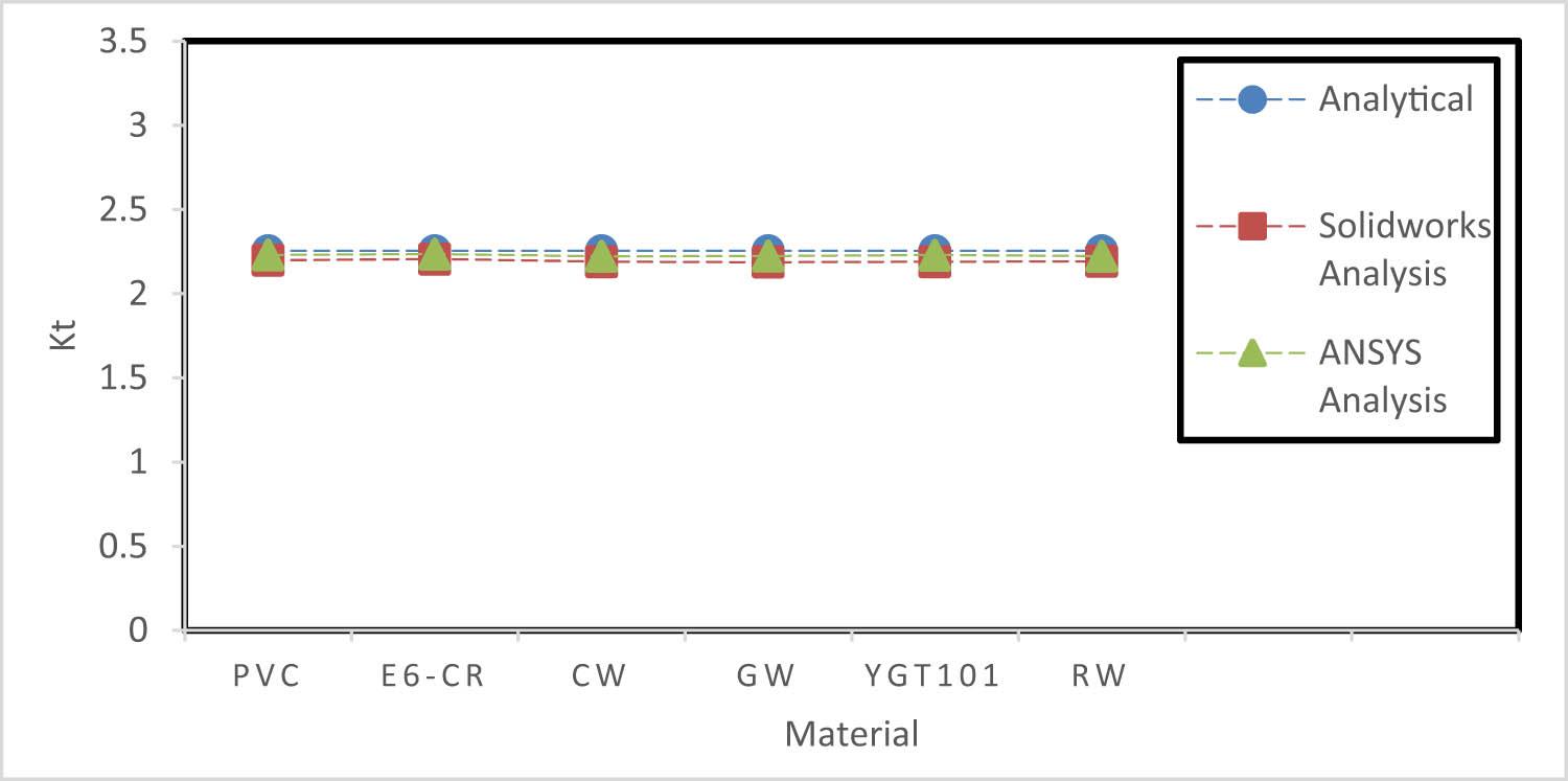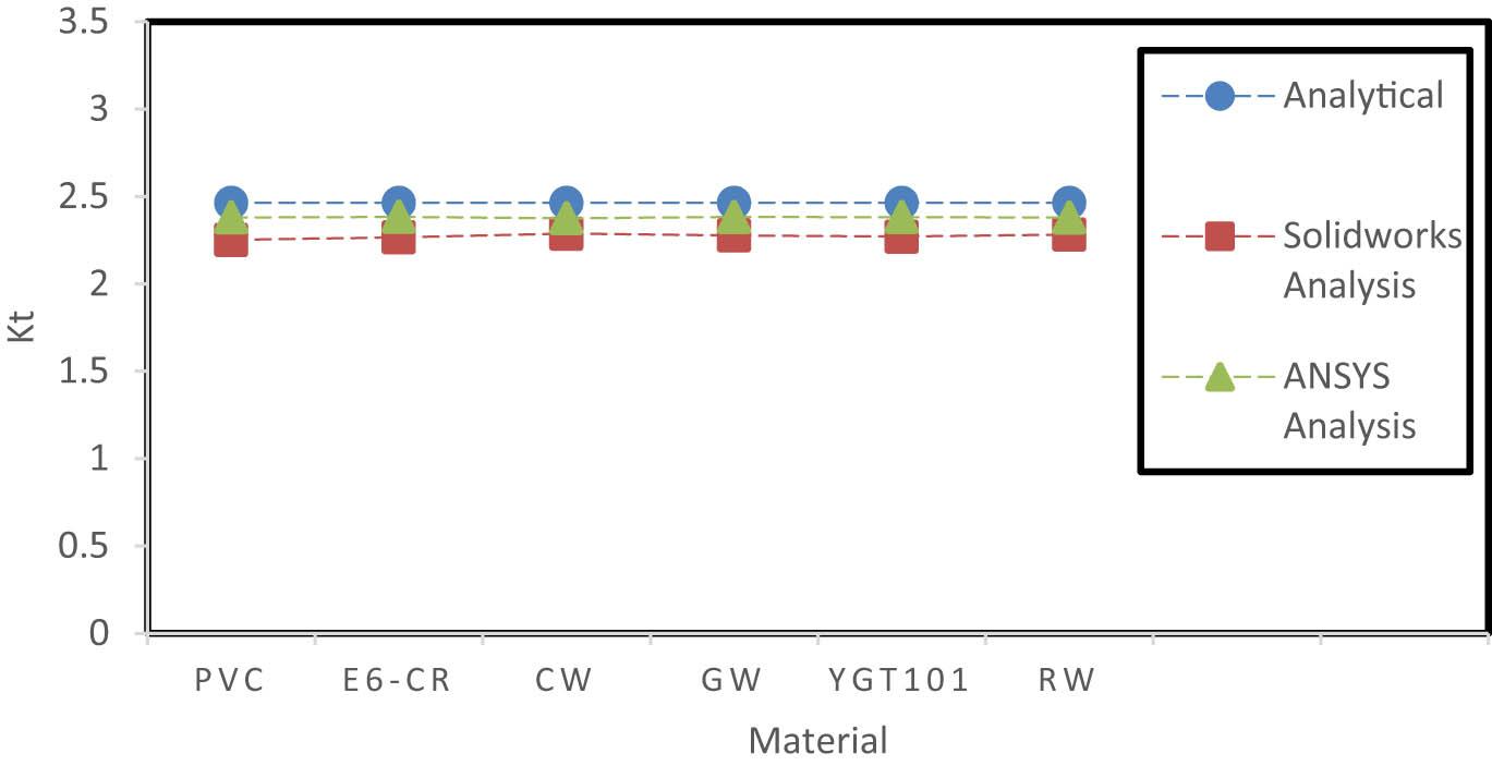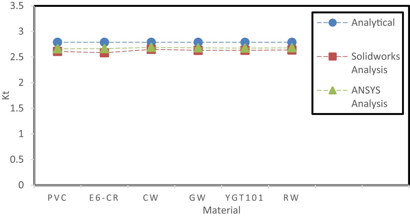 The results indicated that SolidWorks error between its results and analytical results is small at a large hole diameter. On the other hand, the ANSYS error is acceptable for all hole diameters, and for large holes, it is almost the same as the analytical results (Table 10).