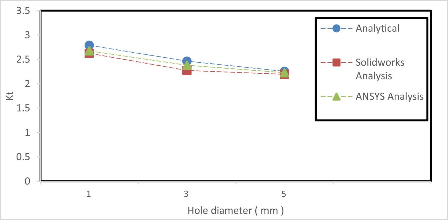 | Hole diameter (mm) | Analytical | Solidworks analysis | ANSYS analysis |