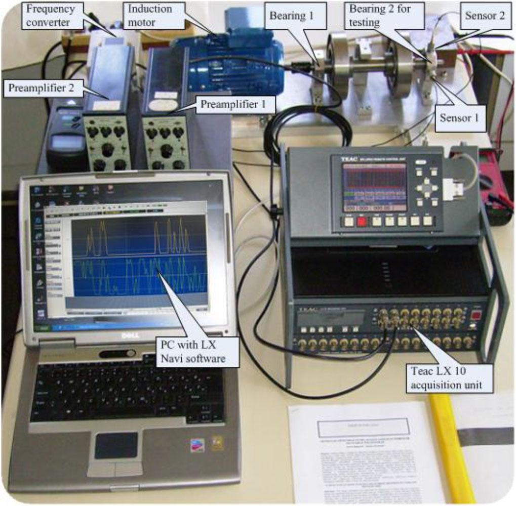 Fig. 1 shows the system used to detect and record rolling bearing vibrations. The vibrations are recorded using two sensors mounted radially on the bearing housing (sensor 1 and sensor 2 placed at a 90° angle). The sensors are piezoelectric accelerometers manufactured by Brüel & Kjær. Low-level signals from the accelerometers are fed through preamplifiers (Charge Amplifier Type 2635, Brüel & Kjær). The outputs of the preamplifiers were connected to two channels of the acquisition and recording system (TEAC LX-10 Recording Unit). The sampling frequency per channel was set to 96 kHz. The LX-10 was connected to a PC on which the parameters of the TEAC were set during recording using special software installed on the computer (LX Navi). The vibrations were measured at a shaft rotation speed of 1518 rpm or 25.3 Hz. The collected digital signals were recorded on a PC and then processed using standard digital signal processing tools.