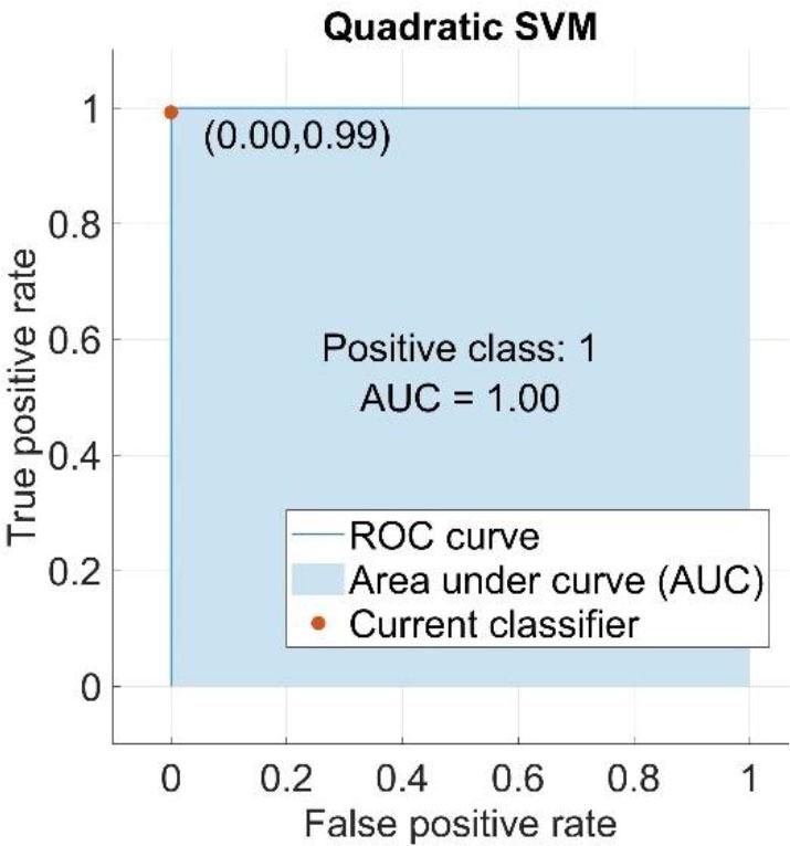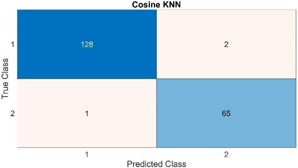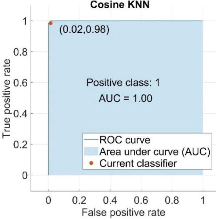 All KNN models achieved high classification success rates, with the highest success rate of 98.5 % achieved by the cosine KNN model. The cosine KNN model calculates the distance metric using cosine with a number of 10 neighbors. The confusion matrix criterion showed that the cosine KNN model had 128 successful and 2 unsuccessful classifications for the first class (damaged ball bearings) and 65 successful and 1 unsuccessful classification for the second class (healthy ball bearings). The ROC curve is a metric that is additionally used as a measure of the classifier quality. Two values are calculated for each threshold: the true positive ratio (TPR) and the false positive ratio (FPR). For a given class i, the TPR is the number of outputs whose actual and predicted class is class i divided by the number of outputs whose actual class is class i. The FPR is the number of outputs whose actual class is not class i, but whose predicted class is class i, divided by the number of outputs whose actual class is not class i.