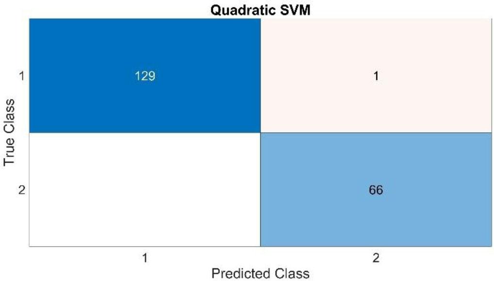Similar to the KNN algorithms, the developed SVM models have also shown high classification success rates. The best performing SVM model is the SVM algorithm with a second-order polynomial kernel function, which achieves a success rate of 99.5 %. The aforementioned model provided only one incorrect classification, which belonged to the first class (damaged ball bearings) (Fig. 4 and Fig. 5).