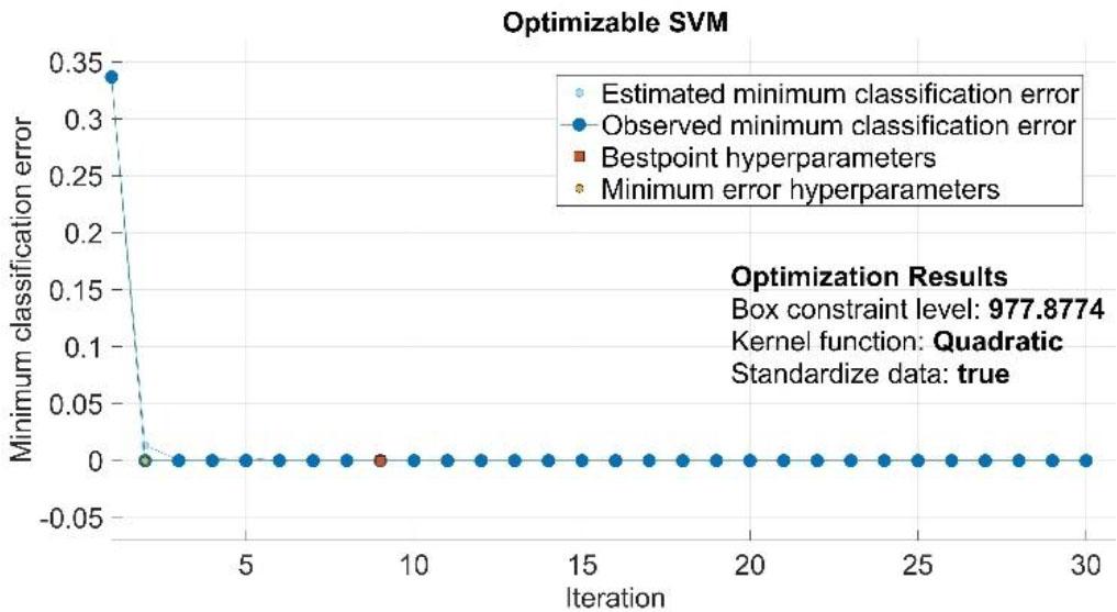 After 78 seconds and 30 iterations, the optimization process was stopped, as shown in Fig. 6. The optimization results as well as the characteristics of the optimized SVM model can be found in Table 5.