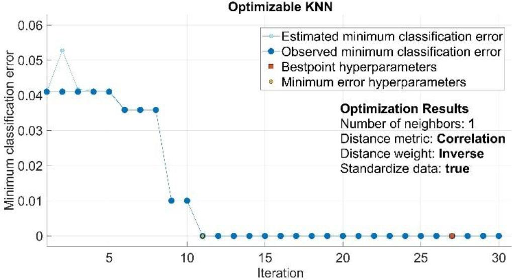 After about 35 seconds and 30 iterations, the optimization process is stopped, as shown in Fig. 7. The optimization results and the characteristics of the optimized KNN model are listed in Table 7.