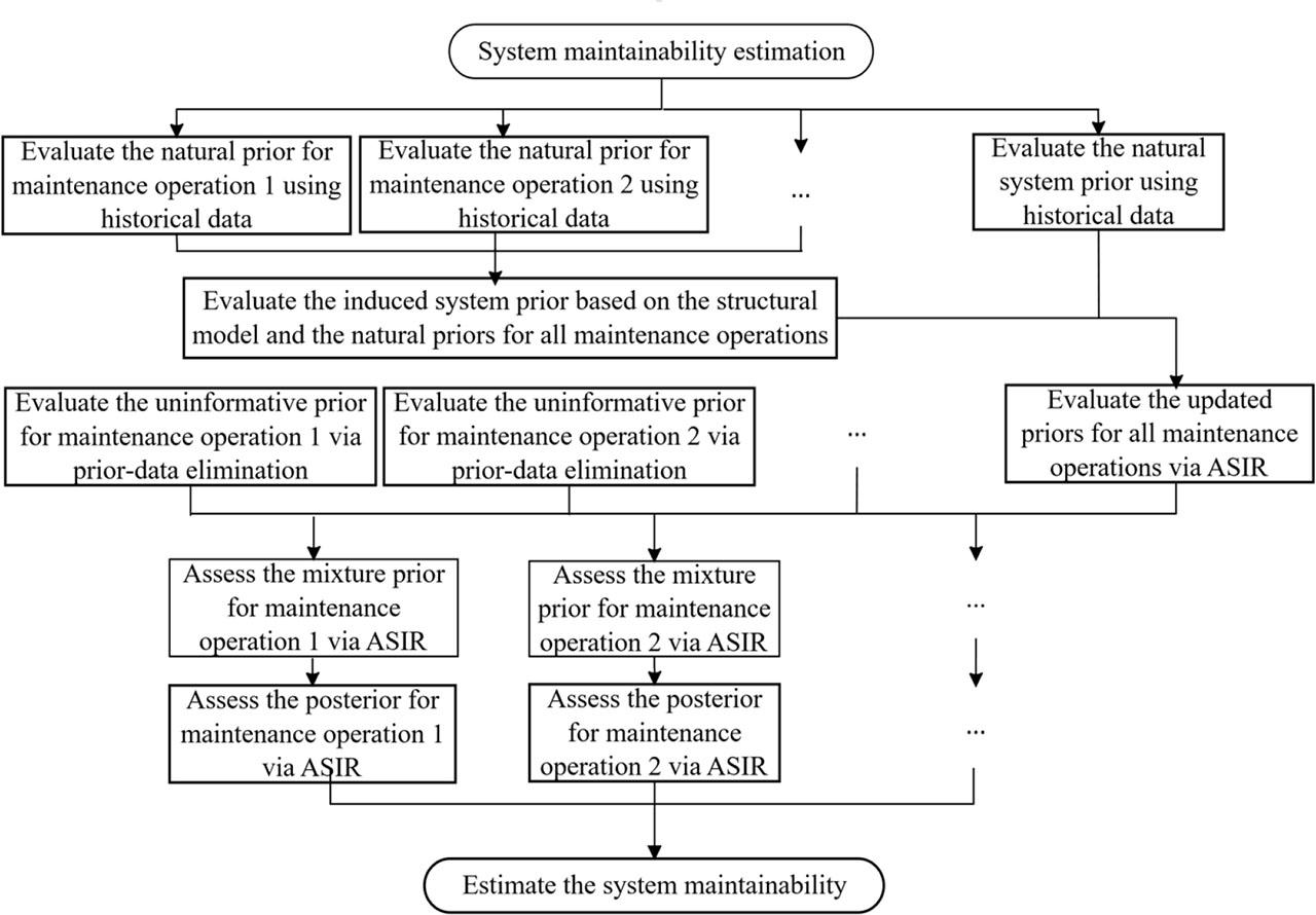 The proposed method is described in detail in this section and its flowchart is shown in Fig. 1. First, the natural prior distributions for the system and each type of maintenance operation are determined based on historical data, and the induced system prior is evaluated based on the structural model and the natural priors for all maintenance operations. Then the BMM is used to obtain an updated prior for each maintenance operation, while a prior-data conflict elimination is used to determine an uninformative prior for each maintenance operation. The uninformative prior and the update prior are combined to generate the mixture prior and thus the posterior for each maintenance operation. Finally, the system maintainability is estimated based on the structural model and the posterior of all maintenance operations.