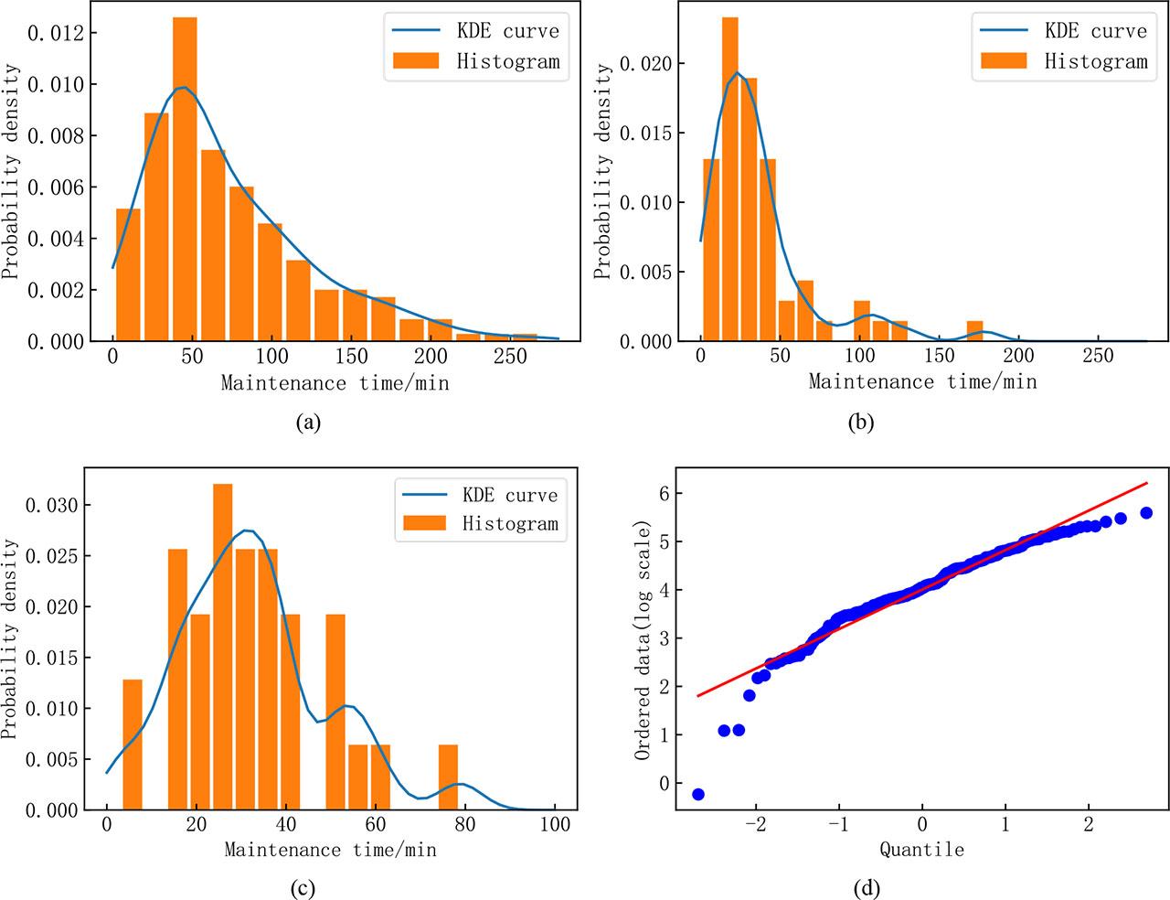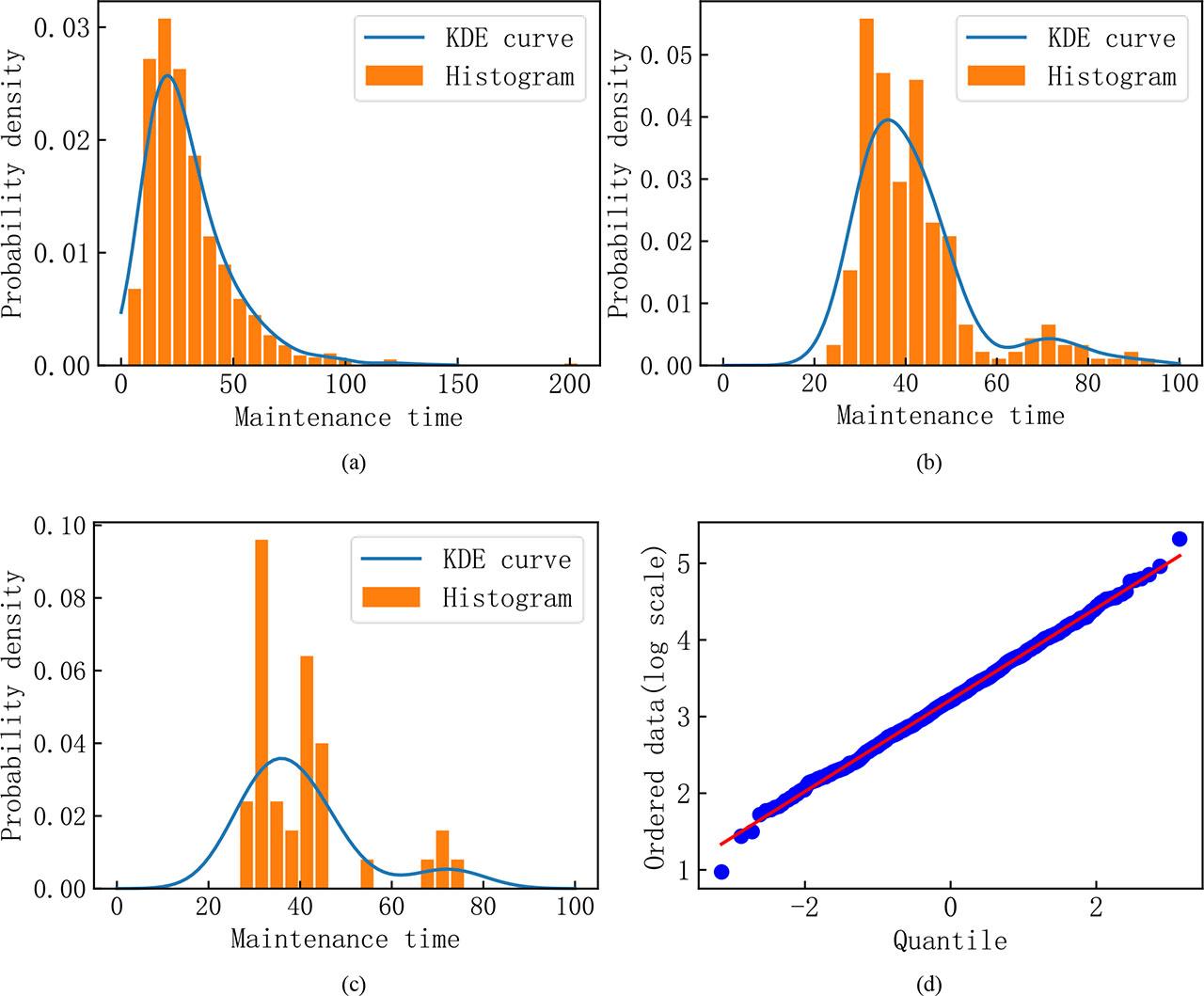 Illustration for the distribution characteristics of practical data; (a)-(c) Histograms and KDE curves for system level data from PT, the three maintenance operation data from PT, and the data from OT; (d) Probability plot for OT data.