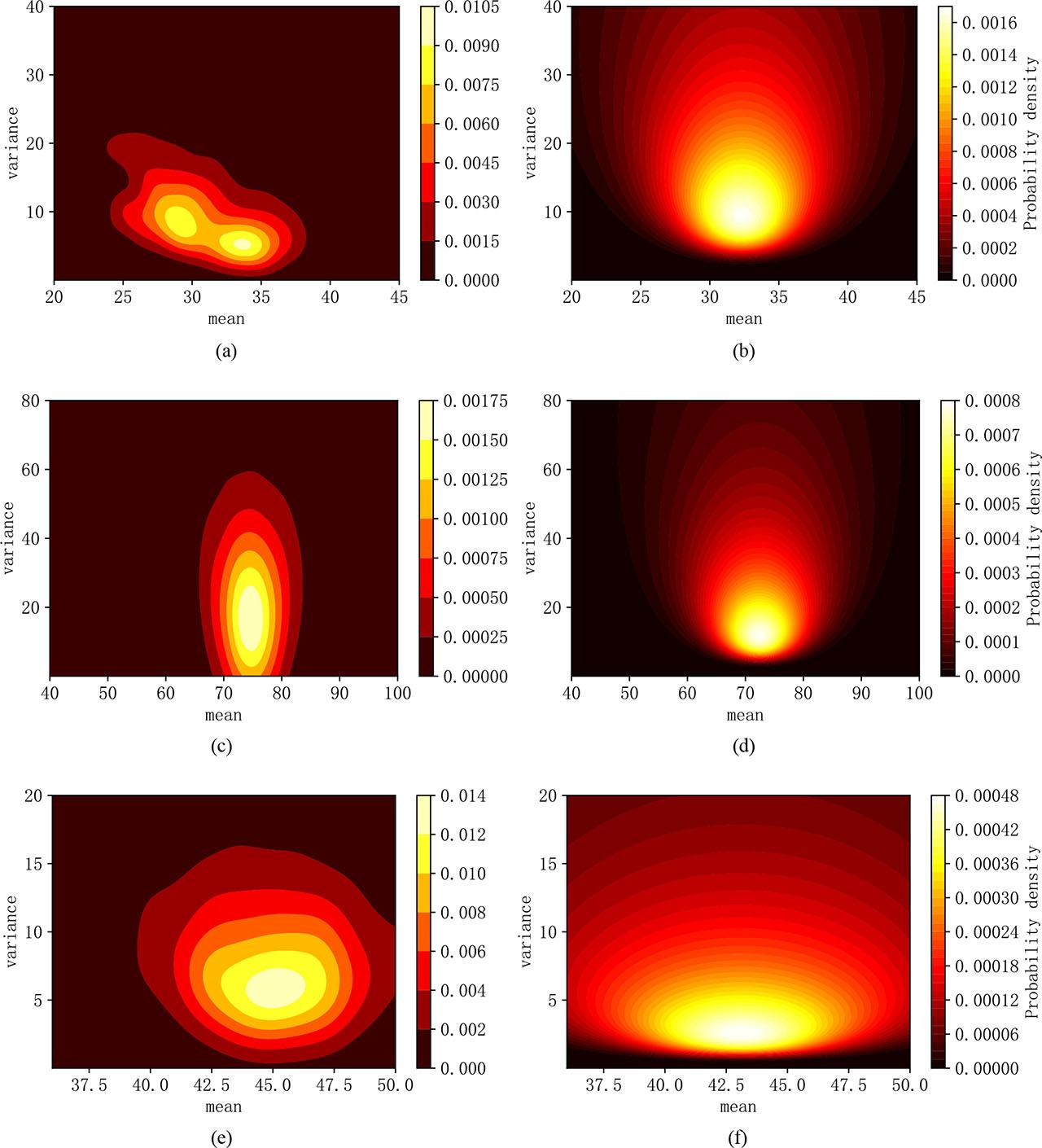 As can be seen in Fig. 3, the regions of the heat maps in (b), (d) and (f) are more dispersed and flatter, which is a characteristic of non-informative priors. Using the methods described in Section 3.4.2, the mixture posteriors can be evaluated on the basis of non-informative and informative priors. In addition, the system maintainability at t = 25 can be estimated based on the methods described in Section 3.5. Similarly, by changing the value of t, the system maintainability at other times can also be estimated. For comparison purposes, system maintainability is also estimated using the following three methods: