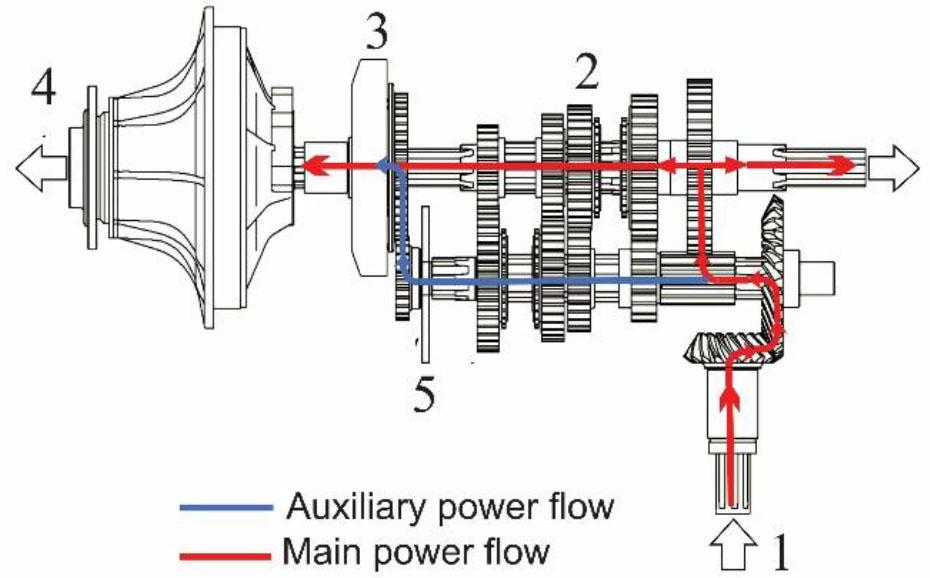 The powertrain shown in Fig. 1 is part of the real subject vehicle powertrain. The power output from the ICE (1), through the gearbox (2), summarizing planetary gear set (3) and to the drive wheels (4) is referred to as the main power flow. The main power flow is always active when the vehicle is in motion. The secondary power flow is referred to as the auxiliary power flow, which is only active when the vehicle is turning.
