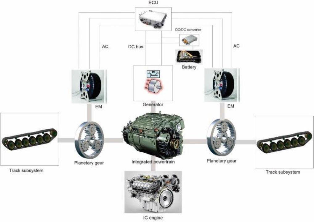 The increased development of hybrid drive technologies in passenger and commercial vehicles since the beginning of the 21st century has quickly focused the attention on the hybridization of high-speed tracked vehicle powertrains [1], [2], [3]. Hybrid powertrains in passenger and commercial vehicles are mainly used to reduce fossil fuel consumption and meet ecological standards [4], [5]. The motives for hybrid powertrain development for high-speed tracked vehicles are completely different and are mainly based on increasing the powertrain energy potential, powertrain and overall vehicle performance for the tasks for which the vehicle is designed and intended [6]. Since the special purpose systems of high-speed tracked vehicles have high electrical power demands, one of the main motives for hybridizing these vehicles is to increase the available electrical energy to be stored in batteries and/or other types of electrical energy storage devices. Hybrid powertrains also enable the reduction of the vehicle thermal and acoustic image, which is of great importance for the tasks for which these vehicles are intended, as well as optimal internal combustion engine (ICE) working regimes and a significant increase in performance with lower vehicle mass in certain hybrid concepts [7], [8].