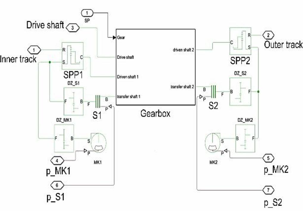 The real vehicle model is equipped with a mechanical steering mechanism consisting of two friction clutches, placed in the auxiliary power flow of the powertrain, labeled S1 and S2, and friction brakes, labeled Mk1 and Mk2, Fig. 3. The friction clutches and brakes are engaged and disengaged from the control block, a signal builder block that defines physical signals for the auxiliary clutch models.
