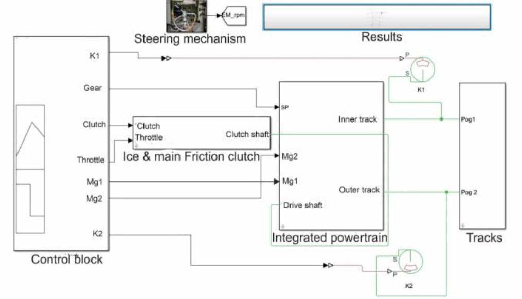 The auxiliary friction clutches are replaced by synchronous electric motors powered by Li-ion batteries. Since there are no auxiliary friction clutches, their activation mechanisms are no longer necessary, so the control block no longer has clutch activation signals, but a signal representing the requested output rpm of the electric motors, labeled Mg1 and Mg2 in Fig. 5. This means that the vehicle turning process is controlled by regulating the angular velocity of the electric motors.