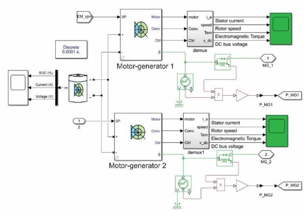 The electric motors are controlled from the control block by setting the desired electric motor output rpm. This is the input parameter for the electric motors. This signal controls the electric motor input parameters from the battery, such as the supply current and voltage required to achieve the desired mechanical output power parameters, such as angular velocity and mechanical torque.