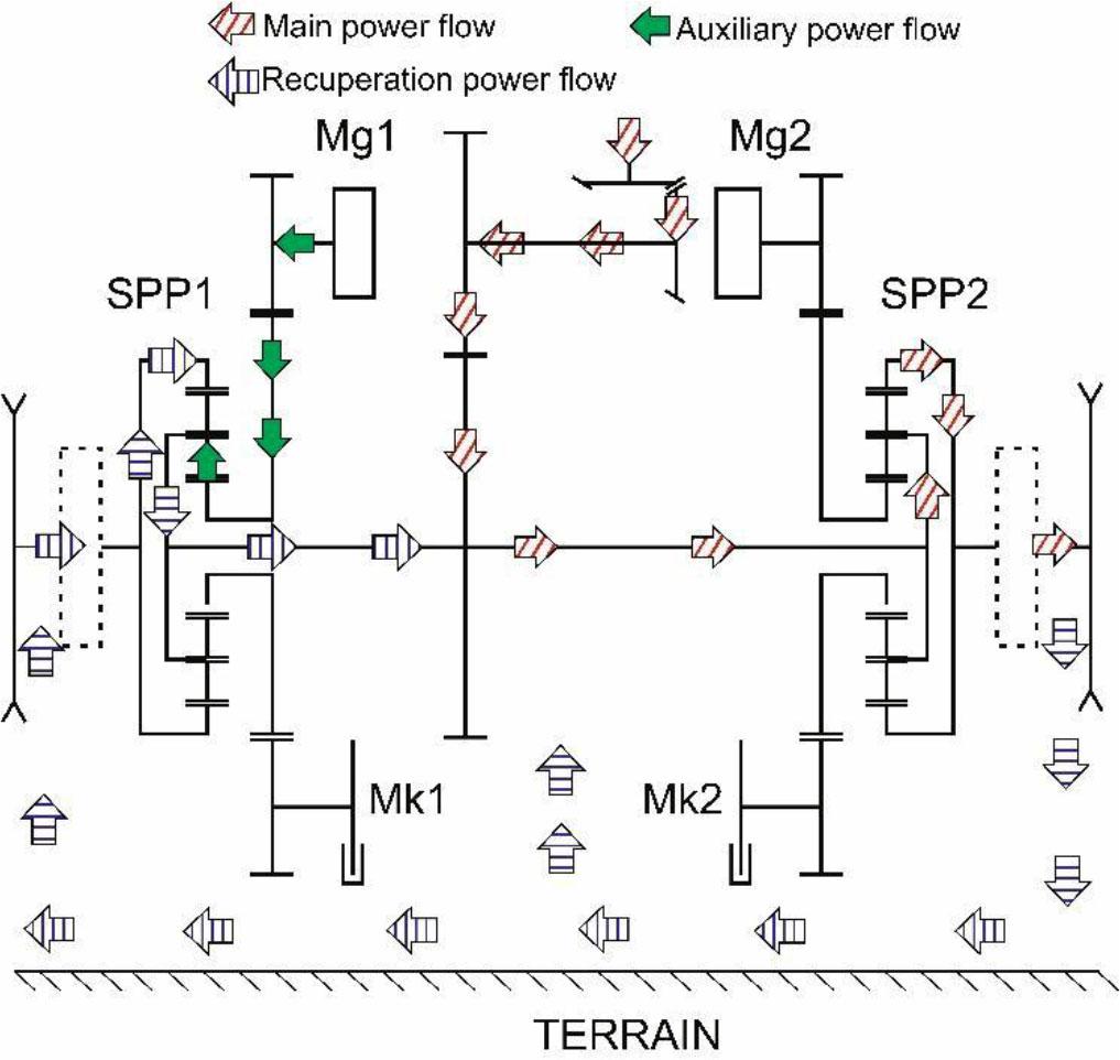 The subject vehicle is a high-speed tracked vehicle with a mechanical powertrain and two power flows, as shown in Fig. 1. Both the mechanical powertrain simulation model and the hybrid powertrain simulation model were developed based on the subject vehicle powertrain.
