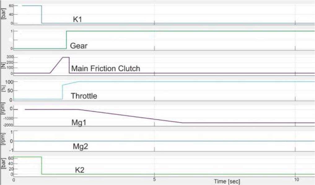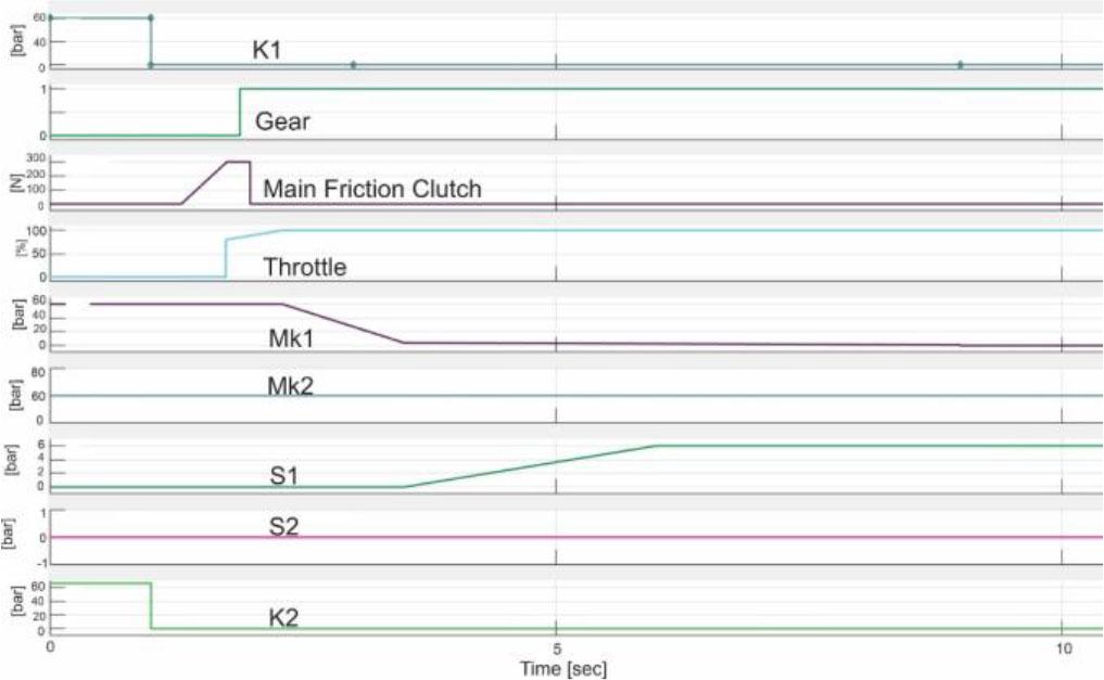 The simulation starts from a steady state for both scenarios, by deactivating the main brakes K1 and K2, first gear is engaged in the gearbox, the ICE rpm remains constant and full throttle is applied, resulting in the same turning parameters for both models at the end of the simulation. The input signals for the mechanical and hybrid models are shown in Fig. 8 and Fig. 9.