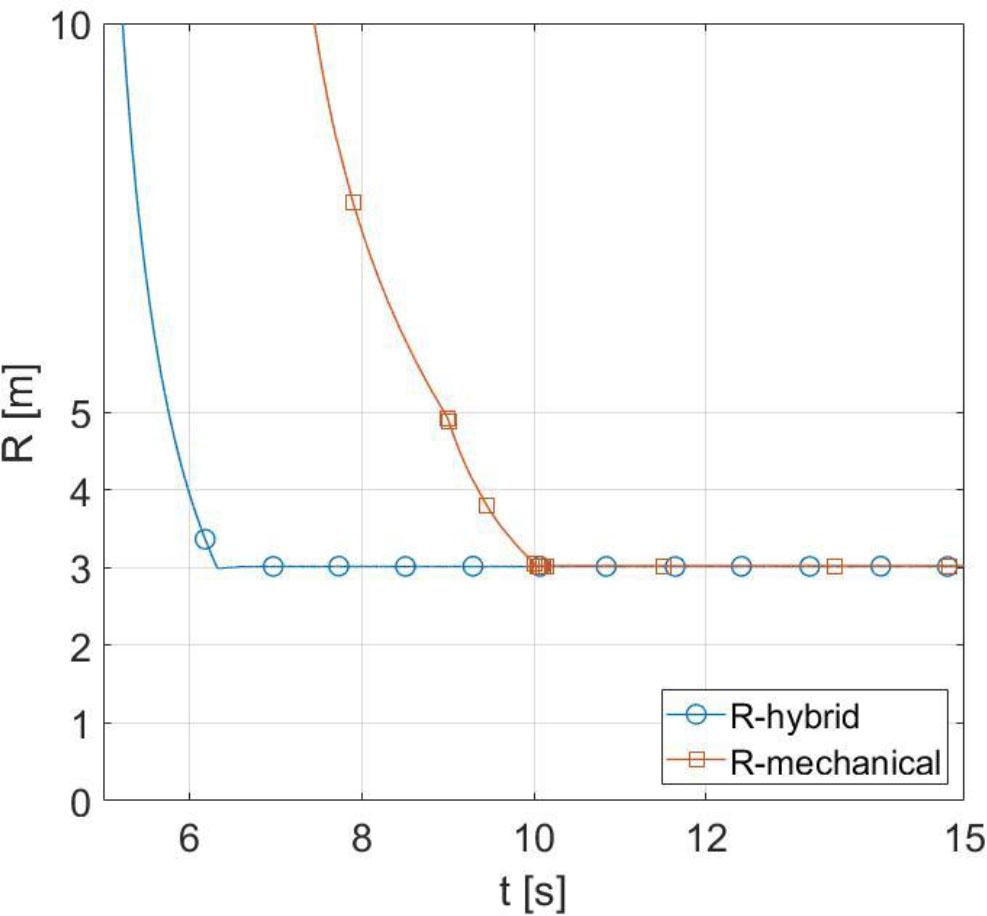 The turning radius for both mechanical and hybrid powertrain models at the end of the turning process with the calculated turning radius (auxiliary clutch fully engaged) is shown in Fig. 10. Both vehicles start the turning process at the same time t = 4 s and under the same conditions with the same kinematic parameters for a goal. The vehicle with the mechanical powertrain reaches the calculated turning radius at t ≈ 10 s with the auxiliary clutch fully engaged. The vehicle with the hybrid powertrain achieves the same turning radius at t ≈ 6 s. This is due to differences in the turning mechanism design. Both powertrains start the turning process at the same moment t = 4 s, namely by releasing the brake of the auxiliary clutch in the mechanical powertrain, i.e., by switching on the electric motor in the hybrid powertrain. In the mechanical powertrain, the auxiliary clutch only starts to engage when the brake is fully released. In the hybrid powertrain, on the other hand, the electric motor has its own brake, which is released by switching on the electric motor as soon as it receives the electrical signal from the control block. This design improvement means that the hybrid powertrain achieves the desired turning radius significantly earlier than the mechanical powertrain.