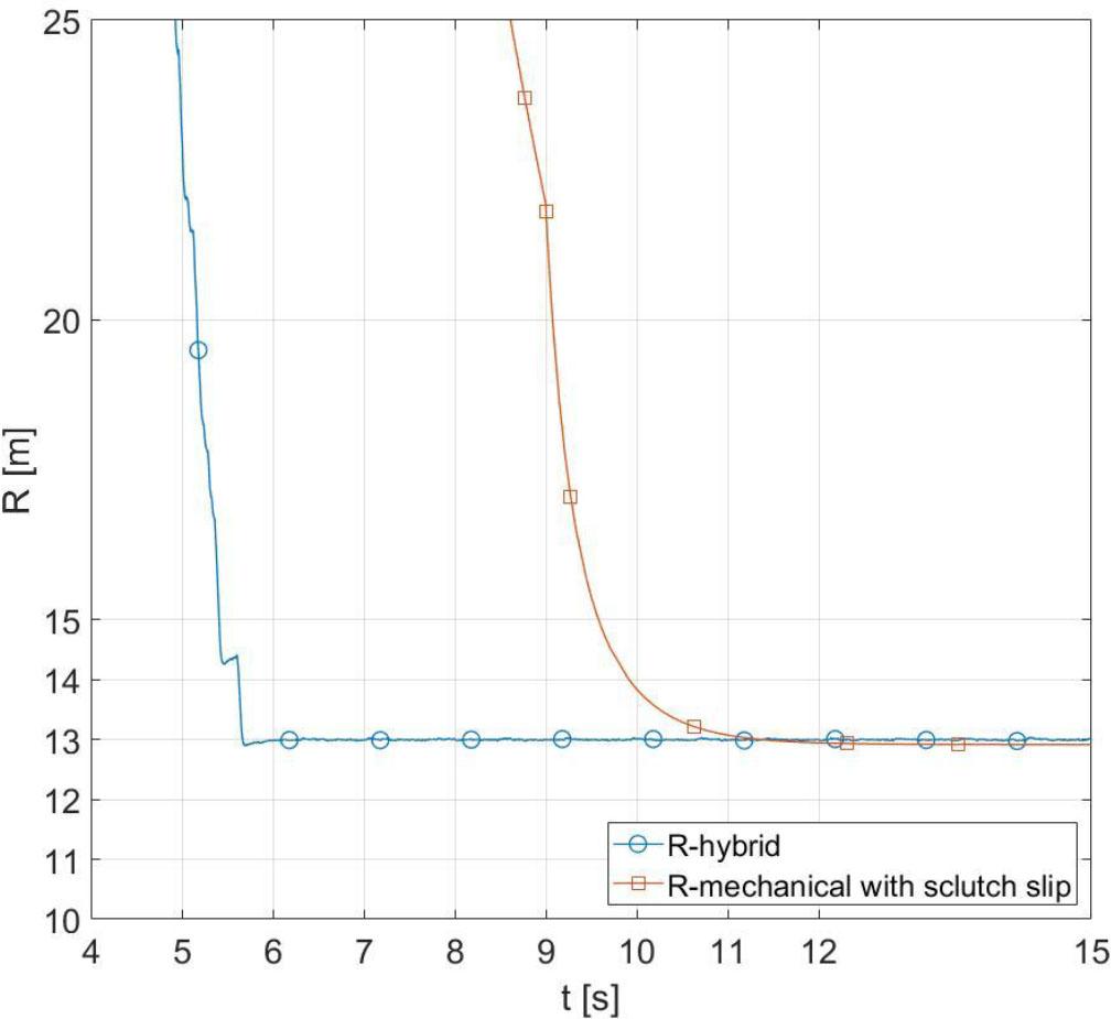 When the auxiliary clutch is engaged at half of the maximum activation pressure value, the mechanical powertrain reaches the turning radius of R = 13 m at t = 11.5 s, as shown in Fig. 11. The hybrid powertrain achieves the same turning radius at t = 5.5 s. As the turning radius of the vehicle is larger, the turning resistance decreases, so the time and power required to reach the desired turning radius should also decrease [30]. The hybrid powertrain confirms this and turns the vehicle faster than in the first scenario. However, the mechanical powertrain exhibits a certain delay and requires even more time than in the first scenario to perform the desired turning process. The reason for this is the auxiliary clutch slip and the power lost due to the partially engaged auxiliary clutch.