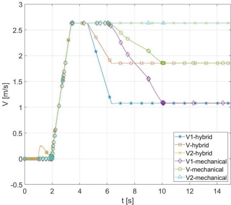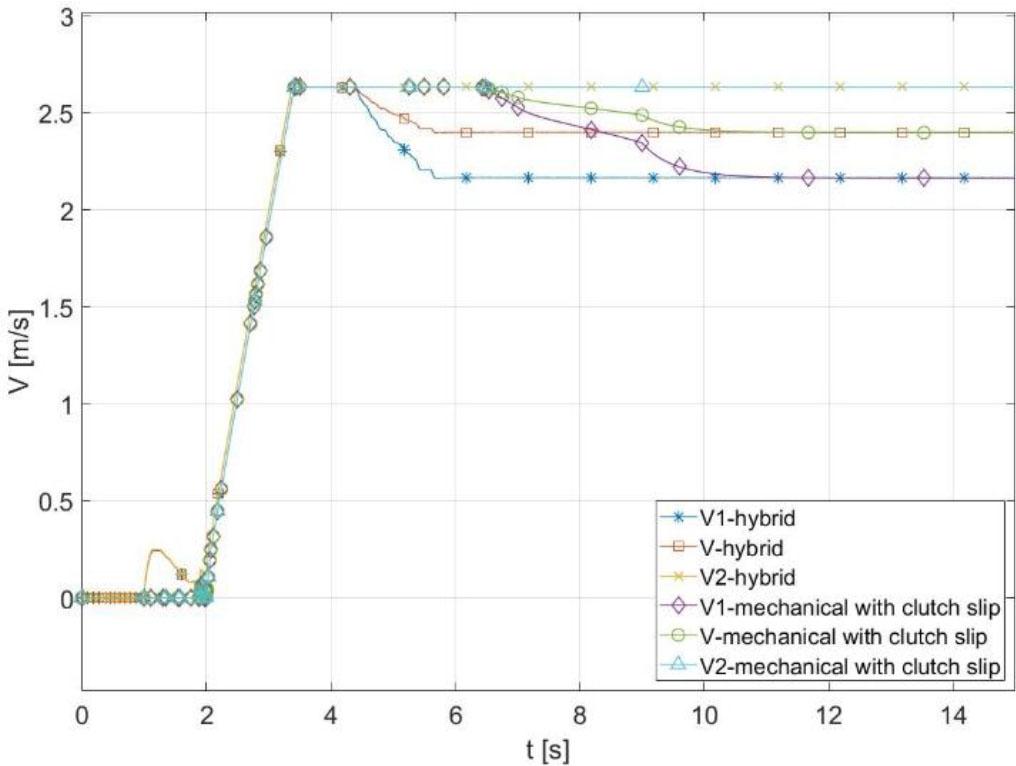 The auxiliary clutch slip scenario shows a similar pattern, as can be seen in Fig. 13. As the turning radius is larger, the turning resistance is lower and the inner track velocities for both vehicle models are higher. The hybrid powertrain inner track reaches the required velocity V1-hybrid ≈ 2 m/s at the same moment t ≈ 6 s as in the first scenario, as there is no auxiliary clutch slip. The inner track of the mechanical powertrain reaches the same velocity V1-mechanical = 2 m/s slightly later than in the first scenario, at t ≈ 11.5 s, because the auxiliary clutch slips because it is partially engaged.