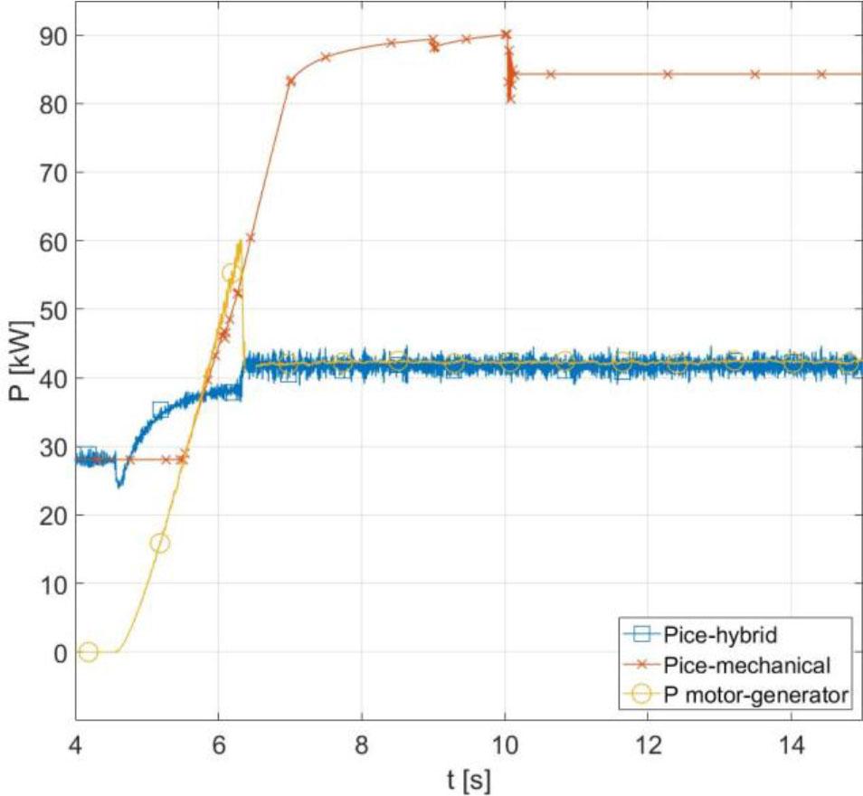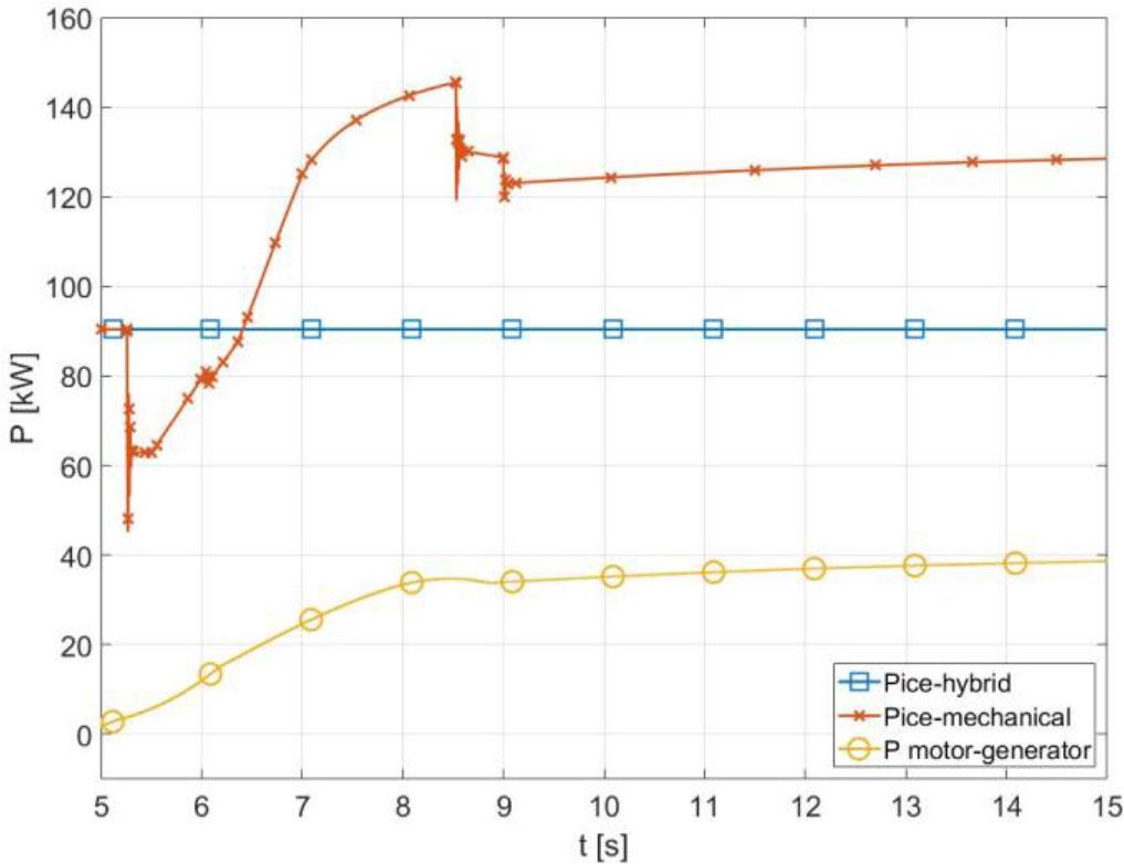 The most important argument to discuss and analyze is the effect of the hybrid powertrain improvement on the overall power balance curve. This is particularly important because the real vehicle mechanical powertrain consumes significantly more ICE power for turning than for the rectilinear movement [33]. We have seen that the hybrid powertrain achieves the desired trajectory and velocities significantly earlier than the mechanical powertrain, but what about power consumption? The power balance curve for the first simulation scenario, turning with the calculated turning radius in first gear, is shown in Fig. 14.