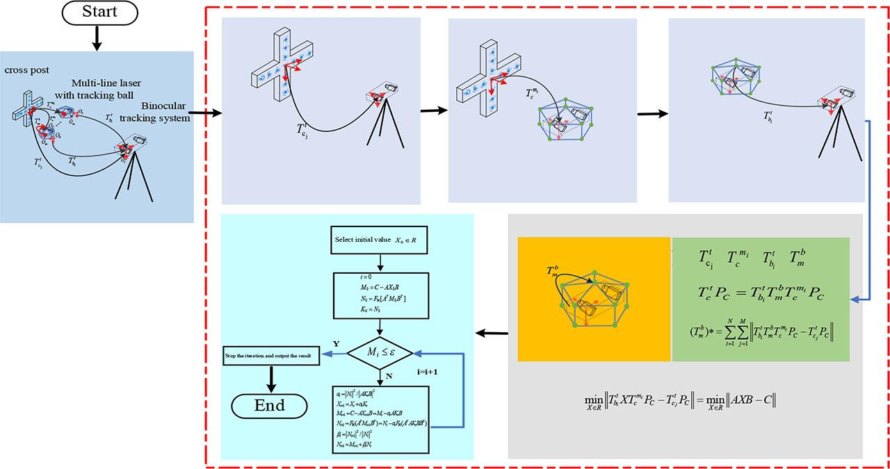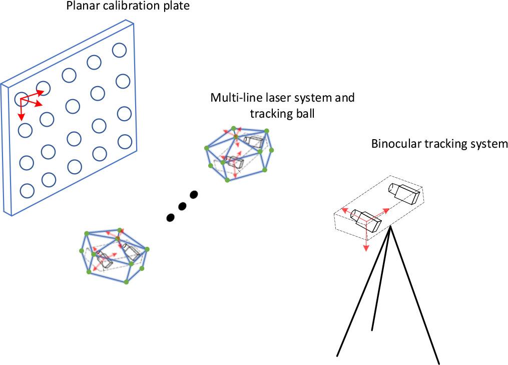 The main purpose of the tracking system is to integrate the binocular system with the multi-line laser system. This is convenient for real-time tracking and stitching of the three-dimensional data reconstructed by the laser system, which is achieved by determining the spatial position of the multi-line laser system in real time. Therefore, the calibration of the whole system includes the calibration of the binocular tracking system and the joint calibration of the multi-line laser system and the tracking ball cage. The conventional joint calibration of the multi-line laser system and the tracking ball cage is based on the plane calibration plate method, as shown in Fig. 1. It realizes the calibration between the tracking ball and the multi-line laser system by calculating the conversion relationship between the plane calibration plate and the camera. However, the use of these plane calibration plates poses great challenges, such as their size, high production cost, and inability to guarantee the plane accuracy. These limitations can lead to a large number of calibration errors and to a complex calibration process. To solve this problem, a multi-position orientations and conjugate gradient iteration method based on the cross pole is proposed to complete the joint calibration between the multi-line laser system and the tracking ball cage. The cross pole is easy to make, and the 3D coordinates of the coding points can be determined in advance using a coordinate measuring machine. The calibration of the binocular tracking system and the joint calibration between the multi-line laser system and the tracking ball cage can be completed by the precise 3D coordinates on the cross pole. The method proposed in this paper, which is based on multi-position orientations and conjugate gradient iteration, can improve the convenience of calibration and achieve higher precision of calibration to improve the final stitching accuracy.