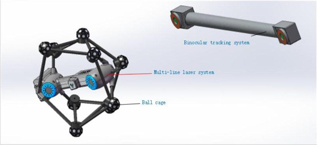 The tracking system hardware essentially consists of three main components: the binocular tracking system, the multi-wire laser system, and the tracking ball cage, which is seamlessly integrated into the multi-wire laser system hardware, as shown in Fig. 2. The binocular tracking system is equipped with two industrial cameras that are mainly responsible for the real-time tracking of the ball cage within a given field of view. In contrast, the multi-wire laser system includes a binocular camera and a multi-line laser, which are primarily intended for the reconstruction of the object. The tracking ball cage, which primarily consists of several polyhedra, is able to determine the spatial and positional relationships of the multi-line laser system.