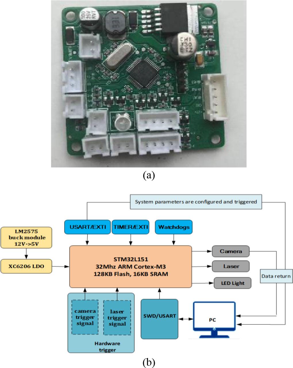 The STM32L151 microcontroller, as shown in Fig. 3(a), is responsible for managing the entire system. This ultra-low power device is based on the high-performance ARM® Cortex®-M4 32-bit RISC core, which can operate at frequencies of up to 80 MHz. The Cortex-M4 core features a single floating point unit (SFPU) with precision and supports all ARM single-precision data processing instructions and types. It also includes a comprehensive set of digital signal processing (DSP) instructions and a memory protection unit (MPU) to increase application security. The hardware control aspect of the system includes synchronization trigger control for the binocular tracking system camera, laser projection, and camera acquisition, and manages the multi-line laser system. In the context of multi-line laser 3D reconstruction, the main task of the controller is to initiate the laser projection and simultaneously trigger the camera to capture the laser image. It then monitors the binocular tracking system and synchronizes the camera triggers to capture the white light image. Trigger acquisition and laser projection can be performed by sending control commands through the serial port. The architecture of the controller’s motherboard is shown in Fig. 3(b), and the timing is shown in Fig. 4.