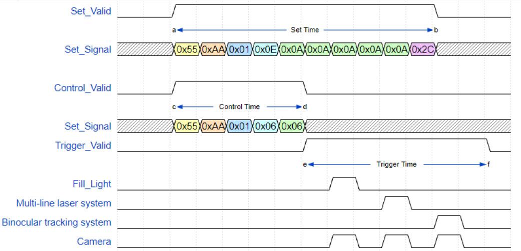 The primary circuitry of the tracking system control mechanism is divided into two main components: system timing configuration and image acquisition management. Fig. 4 illustrates the control protocol using a multi-line laser to capture three images. During the configuration of the system’s timing interval, the Set_Valid signal is activated and the sequence 0x55AA, 0x01, 0x0E, 0x0A, 0x0A, 0x0A, 0x0A, 0x2C is inscribed. This sequence includes the header, the status code, the configuration mode, the duration of the high level for seven-wire laser A, the duration of the low level for seven-wire laser A, the duration of the high level for fill light, the duration of the low level for fill light, the duration of the high level for seven-wire laser B, the duration of the low level for seven-wire laser B, and the checksum of the sequence. The successful configuration of the system timing is confirmed if the sum of the initial nine sequences matches the lower octet of the checksum. When the camera image acquisition control is performed, the Control_Valid control signal is activated and the sequence 0x55AA, 0x01, 0x06, 0x06 is inscribed to identify the frame header of the control signal, the status code, the camera image acquisition trigger mode, and the mode check bit. After checking the correct check bit, the Trigger_Valid trigger signal for image acquisition is activated and triggers the fill light, the seven-wire laser A, and the seven-wire laser B in sequence. The camera acquisition signal then triggers the capture of a white light image, a seven-wire laser A image, and a seven-wire laser B image. After these three images have been captured, the Trigger_Valid signal switches to a low level and thus leads to the reconstruction of the input image collection.