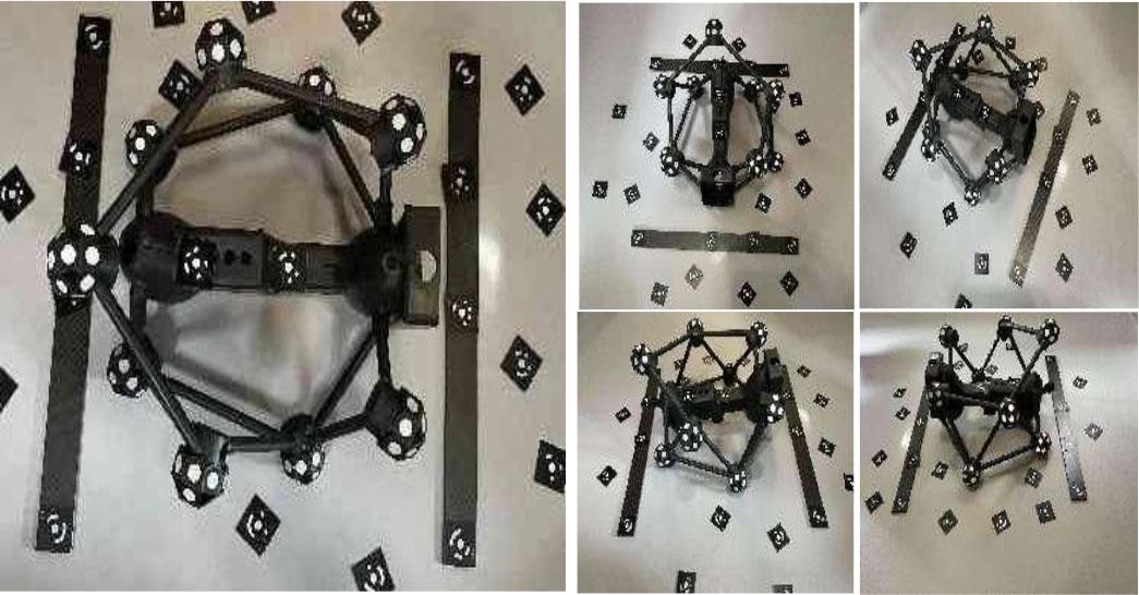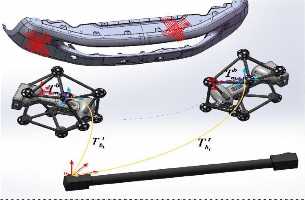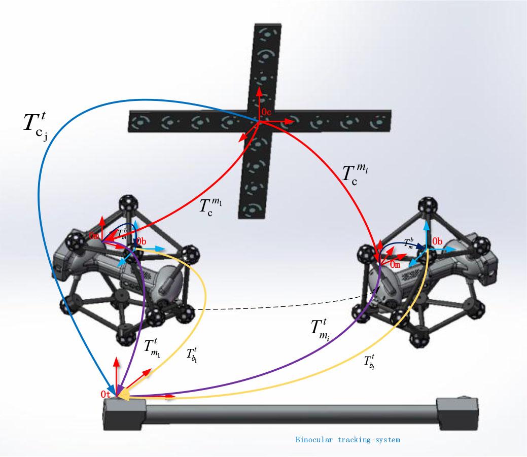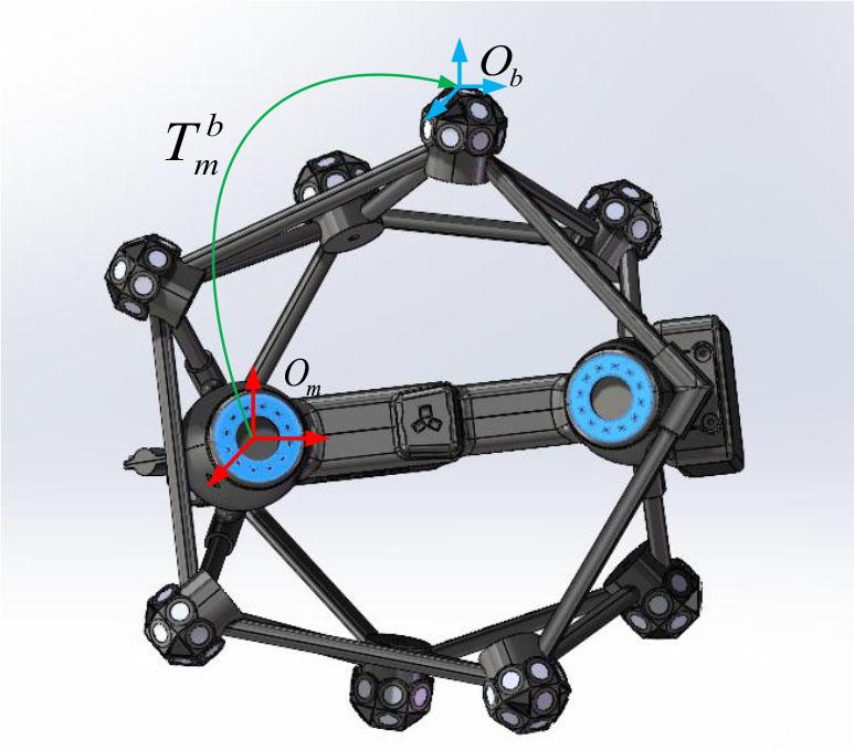 Once the binocular tracking system has been successfully calibrated, the next step towards multi-line laser unmarked point stitching is to complete the joint calibration between the tracking ball and the multi-line laser system. This joint calibration is essentially about establishing a conversion relationship between the two coordinate systems, which ultimately facilitates the translation of the three-dimensional coordinates of the reflective mark points from the tracking ball coordinate system to the multi-line laser coordinate system. To facilitate this, a set of tracking ball hardware is integrated into the hardware of the multi-line laser system, as shown in Fig. 6. This tracking ball hardware consists primarily of several polyhedra, each face adorned with circular marking points made of a special reflective material. Using a photogrammetry method based on multiple views, the three-dimensional coordinates of each circular marking point can be determined relative to a reference cage in which the tracking ball is located. These coordinates were then transformed in relation to the coordinate system of the cage. It is essential that the joint calibration of the tracking ball and the multi-line laser system is performed with an already-calibrated binocular tracking system. Both systems must be positioned in the same field of view to allow simultaneous observation of cross pole, as shown in Fig. 6. The established coordinate system includes the following:
