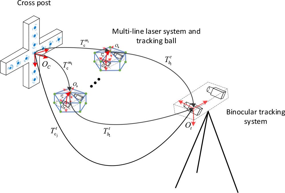 After acquiring the 3D coordinates of all reflective points on the tracking ball cage, the coordinate origin is set to a reflective marker point. The alignment of the binocular tracking system, the multi-line laser system and the cross pole within the same field of view is of utmost importance during the joint calibration process of the multi-line laser system and the tracking ball cage, as shown in Fig. 17. First, the multi-line laser system captures an image of the cross pole to determine its three-dimensional coordinates. A transformation matrix is then calculated from the cross pole coordinate system to the multi-line laser system. The binocular tracking system then captures an image of the cross pole and calculates its corresponding three-dimensional coordinates in its own coordinate system, establishing a conversion relationship between them. At the same time, the images captured by the binocular tracking systems can be sued to establish a correlation between the ball cage and the tracking systems.