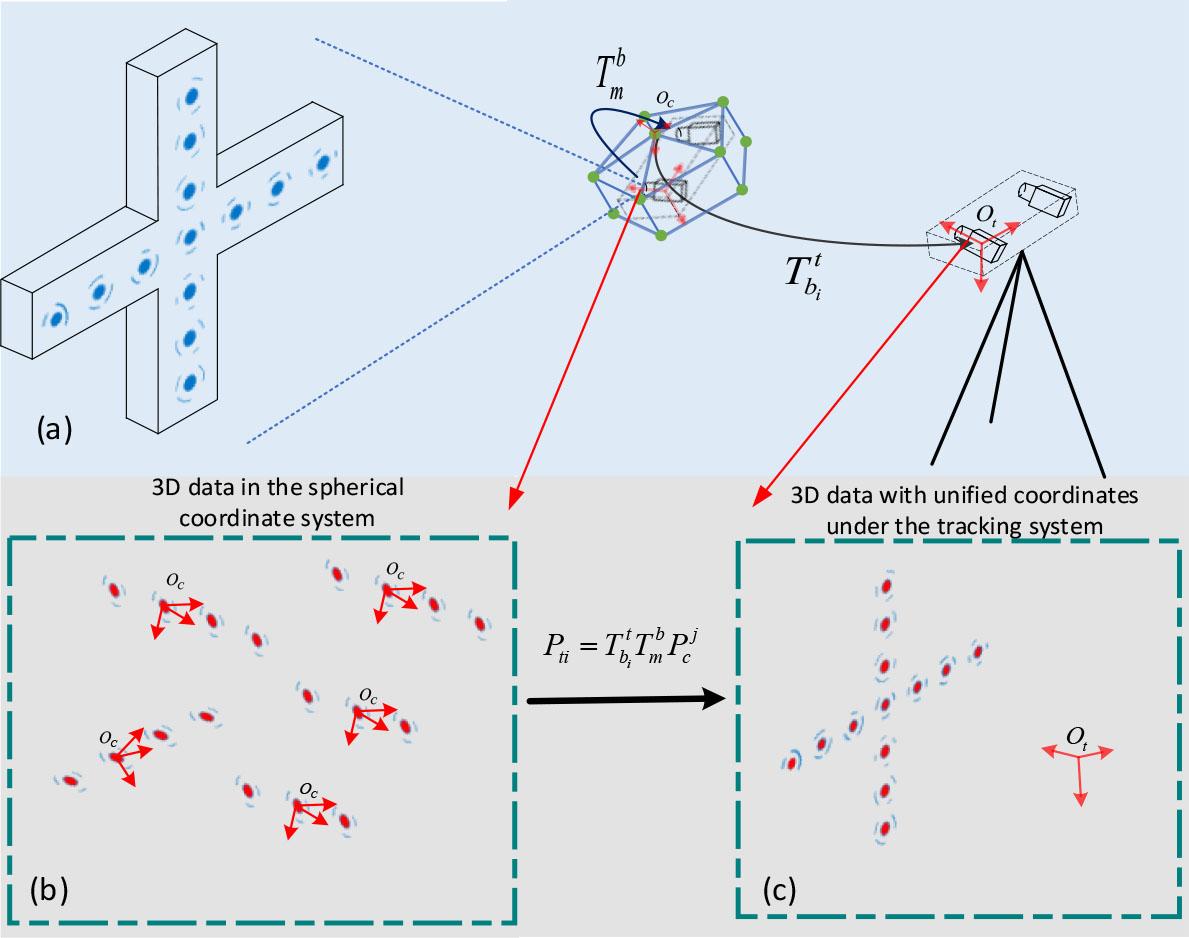 Accurate and visual measurement of objects at large scales is challenging due to factors such as limited equipment, object occlusion, and ambient lighting fluctuations. Obtaining dense and accurate point cloud data through a single measurement is often difficult [1], [2]. The global stitching technique, which uses a multi-view measurement with an optical tracking algorithm, has proven successful in various scanning applications [3], [4]. This method is useful for reconstructing three-dimensional objects within a vast field of view that lack distinct markers. Precise measurements are crucial for the tracking and stitching process to transform individual measurement data into a global coordinate system and to optimize the measurement parameters by matrix correlation transformations [5], [6]. The core of optical tracking lies in the alignment of point clouds, which enables the synchronization of coordinate systems across different test angles [7], [8], [9], regardless of whether it is based on shape [10], [11] or tracking. However, as the measurement range increases and the field of view changes, both marker-based and shape-based techniques are susceptible to cumulative measurement errors. The optical tracking-based measurement approach combines global positioning with a local scanning system. The global tracking system can be achieved by stereo vision technology for a large field of view [12], [13], while the local scanning system can use laser triangulation or grating-structured light systems. The data obtained with the local scanning system can be converted into a unified coordinate system using a global tracking system. Despite the error-free accumulation and flexible measurements, calibration errors occur in the results due to the transformation of the position matrix between the measurement and tracking systems. Barone [14], [15] used a standardized conversion calibration board for the calibration. In this method, the coordinates are converted from the calibration board to the measurement system and then to the tracking system, followed by registration to calculate the transformation matrix. Other researchers have further developed this calibration method to construct various combined measurement systems. J. Shi [16], [17], [19], S. Bai [18], T. Jiang et al. [20] and Y. Zhang [21] have proposed a new approach to reconstruct large objects, which includes an elementary method. In this approach, a structured light measurement system is used as a local scanning system to reconstruct regional surfaces, while a stereo tracker is used for global registration. However, this calibration process is limited by the restriction of the common field of view, as both the tracking system and the measurement system are unable to simultaneously acquire information from the same calibration plate. This limitation renders it unsuitable for calibrations that require shared information from both systems. Furthermore, if the 3D data is distributed on a plane, the registration process becomes invalid due to insufficient dimensional information. The perspective-n-point (PnP) algorithm was developed by QY. Zhou et al. [22] to calculate the transformation matrix between the calibration board and the tracking system, taking into account the monocular visual call in the global system. The calibration process primarily involved changes in the position and pose of the calibration board. However, apart from computational instability, the PnP method is sensitive to variations in pixel intensity and measurement depth during attitude estimation and registration. Since the scale information between the local and global coordinate systems is not considered, the calibration accuracy is affected, leading to unstable calibration results. G. Xu et al. [23], [24], proposed a laser sensor with unrestricted installation positions and local attitudes, so that calibration of both the sensor and the global version system is not required. However, this approach still requires a pre-calibration of the laser plane, i.e. it only replaces the camera-to-laser coordinate system with the camera-to-plane plate transformation. In addition, a wide field of view is required to capture both flat plates and laser strips within the range of the global camera. Zhao et al. [25] have presented a simple method for calibrating non-overlapping cameras that allows specific camera position recognition. Although the conversion relationship can be established with already calibrated cameras, the accuracy varies across different positions within the field of view despite uniform distribution of these markers during use. Therefore, in cases where the calibration plates are not distributed within the high-precision field of view area, the accuracy cannot be guaranteed. In the study by Sarmadi et al. [26], two-dimensional calibration plates and three-dimensional marker points were used to estimate the three-dimensional structure and relative posture of planar markers. However, these traditional calibration methods pose a number of challenges in practice, mainly due to their inconvenient operation and the inability to guarantee the accuracy of the final calibration.