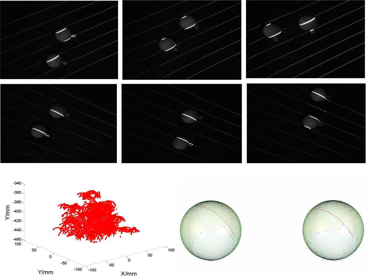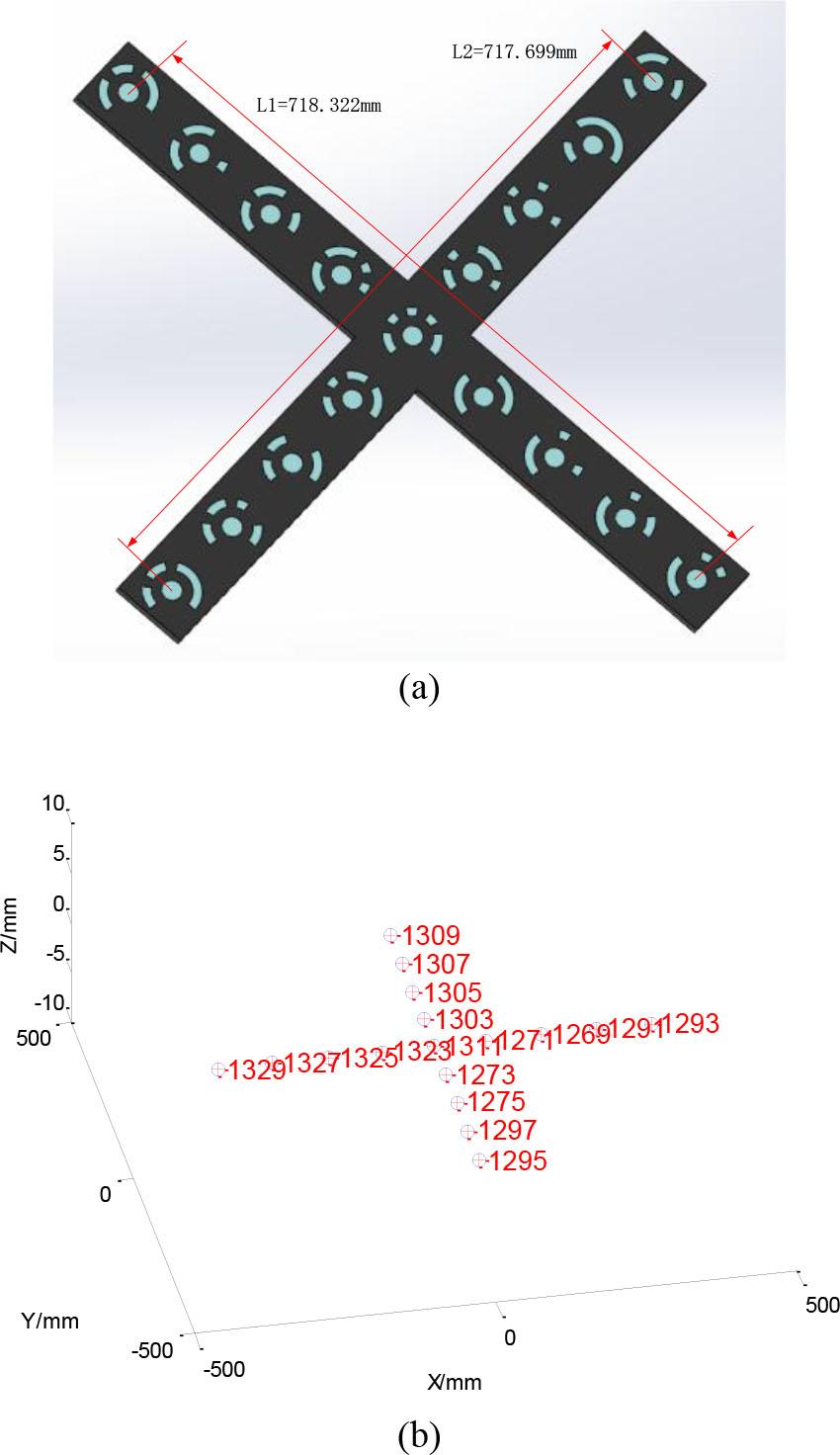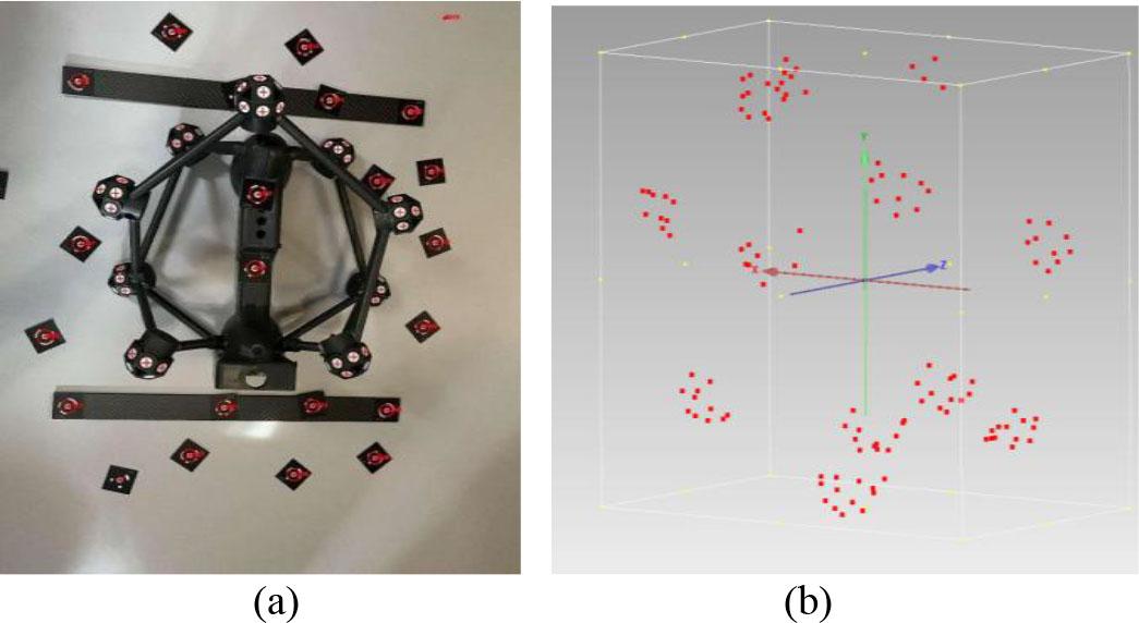 The calibration procedure for the multi-line laser system and the tracking ball requires the establishment of a transformation relationship between their coordinate systems. Before starting the joint calibration, it is essential to determine the three-dimensional coordinates of all reflective markers adorning the tracking ball cage and to mark these points on its surface. The tracking ball cage is located on a planar surface encircled by coded marking points, as shown in Fig. 15. A single lens reflex camera is used to capture multi-faceted images from different angles surrounding the tracking ball, and photogrammetry algorithms are used to derive three-dimensional coordinates for each marker point. Fig. 16(b) shows the reconstructed three-dimensional coordinates obtained by tracing all reflected markers on the ball cage.