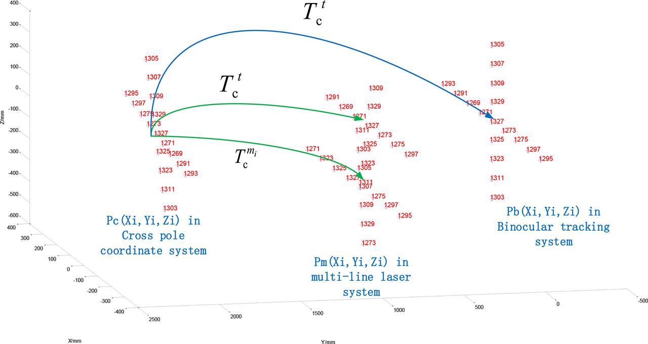 The 3D points Pc(Xi, Yi, Zi) of the cross pole in its own coordinate system as well as the reconstructed points Pm(Xi, Yi, Zi), Pb(Xi, Yi, Zi), are shown in Fig. 18 with both the multi-line laser system and the binocular tracking system. The conversion matrix