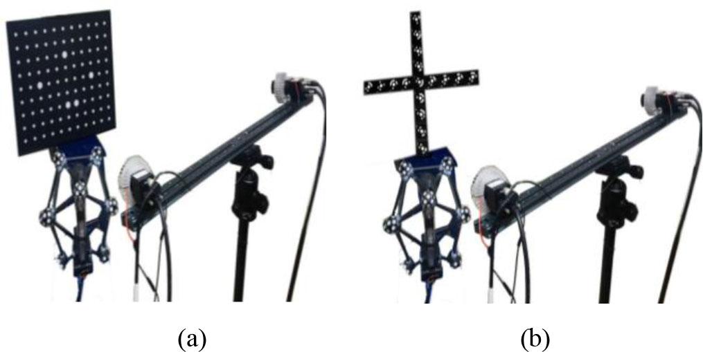 Schematic diagram of the joint calibration comparison, (a) Joint calibration based on a flat plate; (b) Joint calibration based on a cross pole.